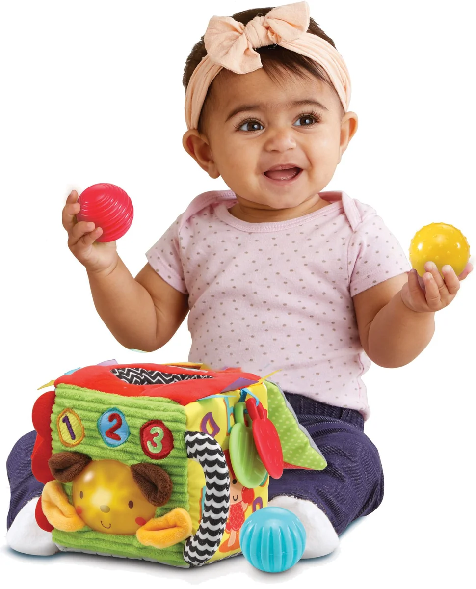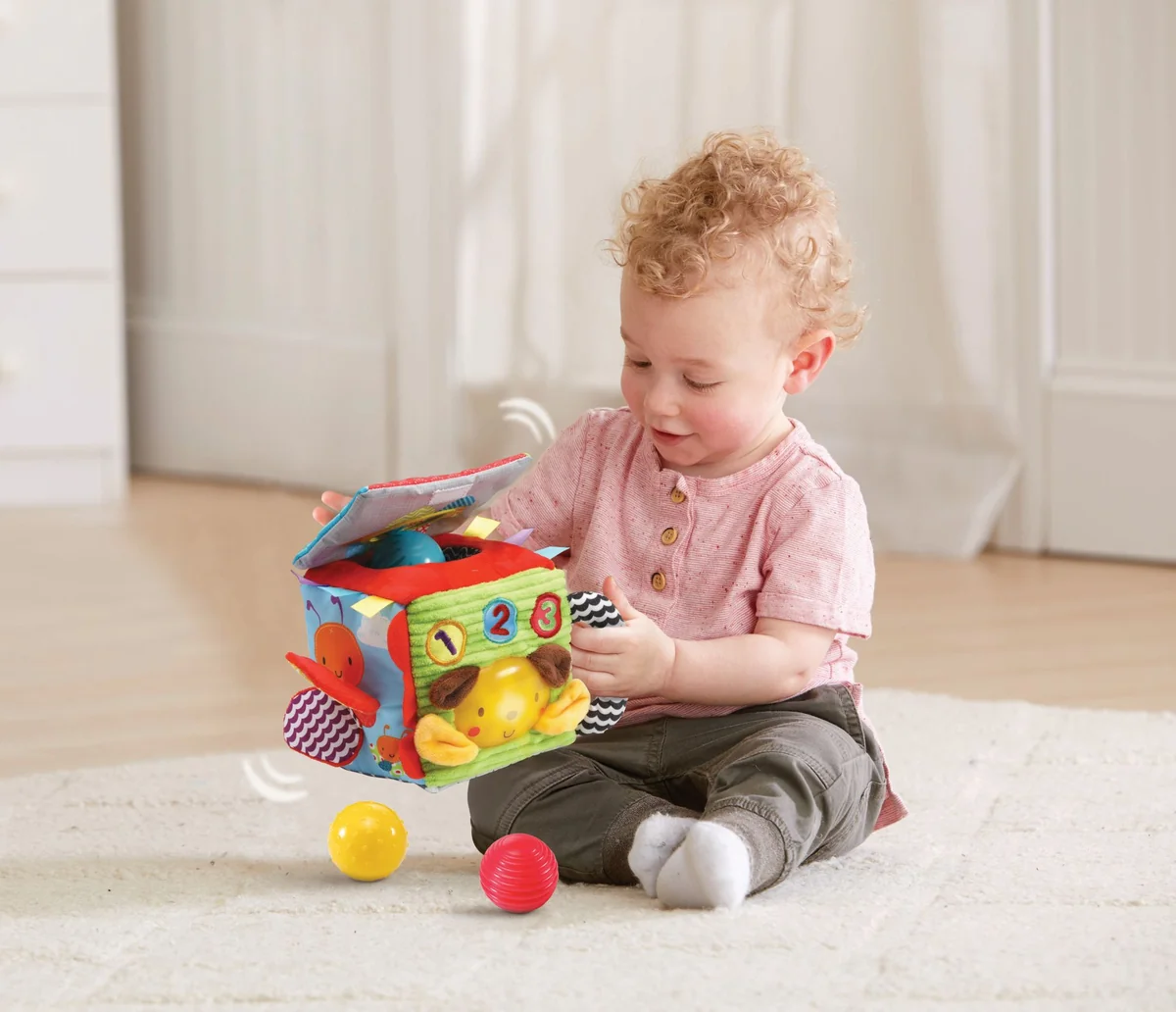6 Seiten voller Spiel, Spaß und Abenteuer! Mit Licht, lustigen Geräuschen und 3 weichen Bällen. Inkl. Abschaltautomatik, Lautstärkeregler und kindersicherem Batteriefach. Batterien enthalten. Ab 3 Monaten. 6 Seiten voller Spiel, Spaß und Abenteuer! Würfel mit 6 Seiten voller unterschiedlicher Gegenstände, zum Entdecken, Lernen und Spielen Verschiedene Oberflächen regen den Tastsinn an Aufleuchtender Welpe singt, spricht und spielt tolle Melodien Reagiert auf Bewegungen mit lustigen Geräuschen 3 Weiche Bälle, zum Einwerfen in den Würfel 3 gesungene Lieder 15 Kindermelodien Lautstärkeregler, kindersicheres Batteriefach und Abschaltautomatik Demobatterien sind enthalten