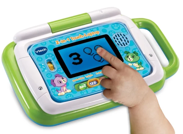 Laptop und Tablet in einem! Der Laptop lässt sich kinderleicht in ein Tablet mit Touch-Screen verwandeln 10 Zahlentasten und 26 Buchstabentasten, 1 Pfotentaste, Modus-Schalter, Spaß-Taste 5 Spielmodi, 10 Aktivitäten: 1) Buchstaben: Buchstaben und ihre Laute 2) Tier-ABC: jedem Buchstaben ist ein Tier zugeordnet, Buchstabenblasen platzen lassen 2) Zahlen: 1 bis 10 3) Nachrichten: Scout und Violet verschicken lustige Nachrichten, auf die das Kind per Textnachricht oder per Emoji antworten kann 4) Spiele: Interessante Tierfakten Bildausschnitte erkennen und durch das Drücken der richtigen Buchstabentaste vervollständigen, Dinge finden 5) Musik: 2 gesungene Lieder zu den Themen Buchstaben und Zahlen 13 Melodien LCD-Bildschirm Mit praktischem Tragegriff Die beiden niedlichen Hündchen Violet und Scout führen durch die verschiedenen Spiele und Aktivitäten Lerninhalte: Buchstaben, Buchstabenlaute, Zahlen, Wortschatz, Tiere, Feinmotorik, Schreiben Personalisierbar: Name des Kindes kann gespeichert werden Mit Elternkontrollbereich Kindersicheres Batteriefach und Abschaltautomatik Lautstärkeregler Demobatterien enthalten