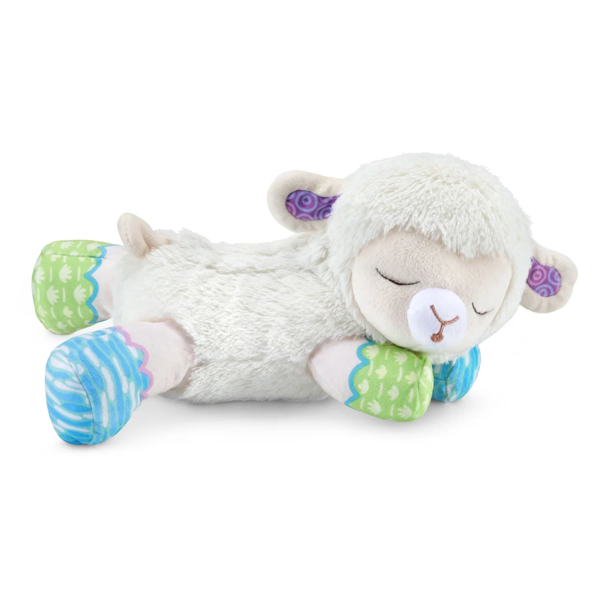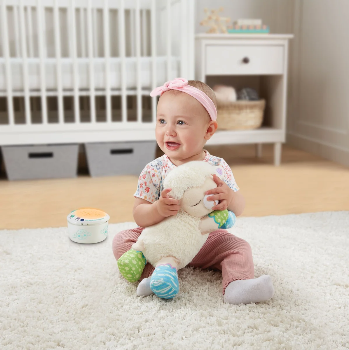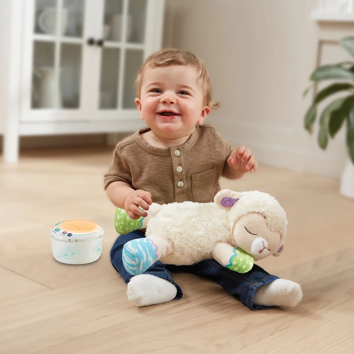 3-in-1: Lichteffekte (2 Projektionsmuster und klassisches Nachtlicht), entnehmbares elektr. Modul, weiches Plüschtier. Mit 3 beruhigenden Soundmodi, Geräuschsensor, Timer-Funktion und Abschaltautomatik. Batterien enthalten. Ab 0 Monaten. Niedliches Schäfchen aus Plüsch, das mit tollen Lichtprojektionen und Liedern beim Entspannen hilft! 3 in 1: Schäfchen mit Lichtprojektionen und Nachtlicht, entnehmbares elektronisches Modul, weiches Plüschtier. Das elektronische Modul projiziert beruhigende Motive an die Decke, fungiert als Nachtlicht und spielt beruhigende Musik und Geräusche. Mit 3 austauschbaren Schablonen, die auf das Modul gesetzt werden können und verschiedene Leuchteffekte erzielen: 2 Muster (Sternenhimmel, bunte Formen) und klassisches Nachtlicht. 3 Modi: 25 Natur- und Alltagsgeräusche (z. B. Meeresrauschen, Grillenzirpen, Wasserfall, Ventilator), 5 beruhigende Reime und Gedichte, 3 gesungene Lieder und 40 Melodien. Geräuschsensor lässt die Melodien erneut erklingen, sobald das Baby weint. Timer-Funktion für automatisches Abschalten nach 15, 30 oder 45 Minuten. Das elektronische Modul lässt sich herausnehmen, sodass das Schäfchen dann als Kuscheltier benutzt werden kann (Klettverschluss an Oberseite) das Modul kann dann auch separat als Entspannungshilfe verwendet werden. Plüsch kann nach Entnahme des elektronischen Moduls per Handwäsche gereinigt werden. Lautstärke- und Lichtregler. Kindersicheres Batteriefach und Abschaltautomatik. Demobatterien sind enthalten.