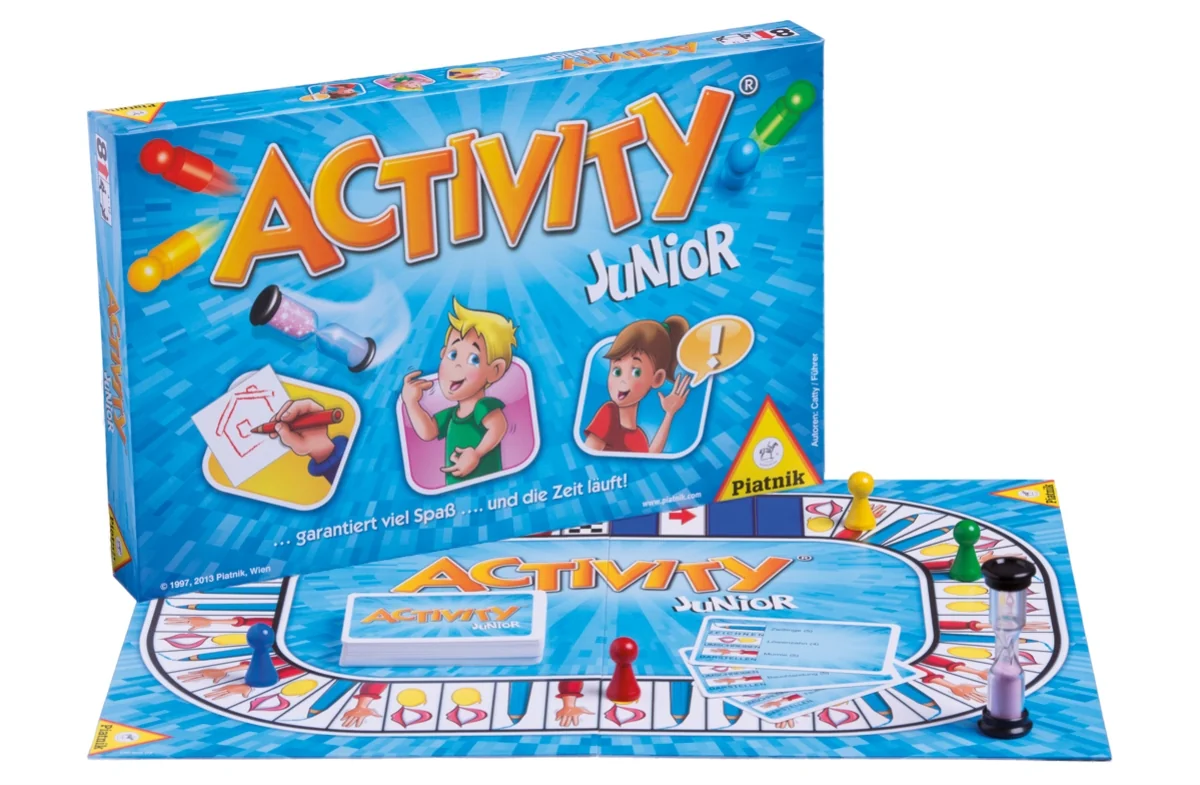 Partyspiel. Für 3-16 Spieler. Ab 12 Jahren. Activity JUNIOR- Garantiert viel Spaß - Einen Lehrer pantomimisch darstellen, eine Rechtskurve mit Worten umschreiben oder ein Glühwürmchen zeichnen,... und die Zeit läuft! Diese und ähnliche Aufgaben erwarten Kinder ab 8 Jahren in dieser Activityausgabe. Und eines ist garantiert: Hände, Füße und Lachmuskeln der Kids kommen bei diesem Spiel sicher nicht zur Ruhe! Die Begriffe sind dem Wortschatz und dem Verständnis von Kindern der empfohlenen Altersgruppe angepasst.
