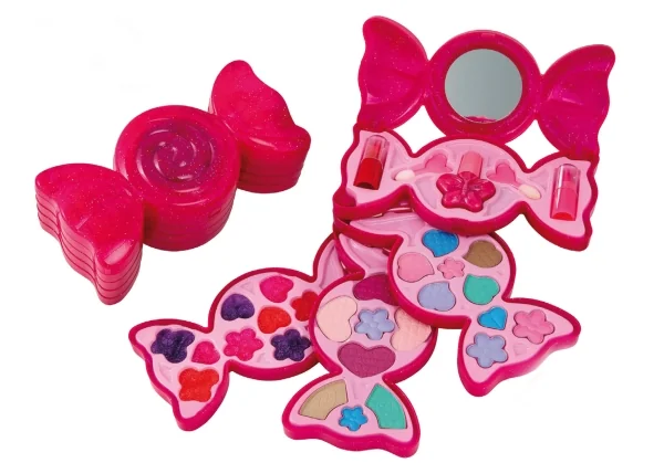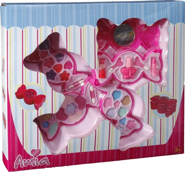 Schatulle mit Spiegel und vielen Zubehörteilen. Ab 3 Jahren. Amia Schmink-Set, groß in einer bonbonförmigen Schatulle mit Spiegel. Inhalt: verschiedene Farben Lidschatten, Ligloss, Lippenstifte, Nagellack und Lidschattenpinsel. Maße ca. 39x6x34 cm. Für Kinder ab 3 Jahren.
