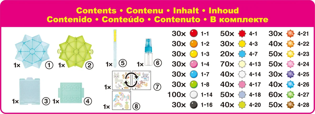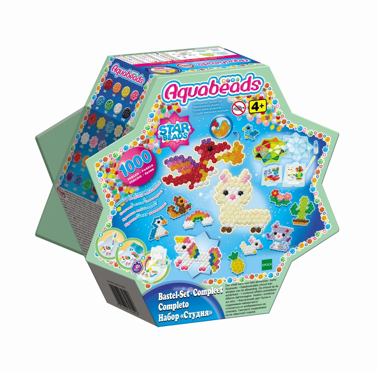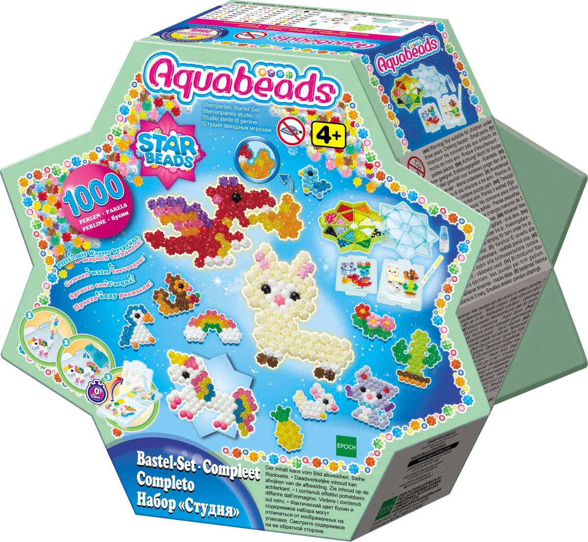 Das Original seit 2004! In einzigartiger sternförmiger Perlenform, die mit allen anderen Aquabeads kompatibel sind und sich ebenfalls nur durch das Besprühen mit Wasser verbinden. Mit über 1.000 Perlen in 24 verschiedenen Farben. Ab 4 Jahren. Aquabeads das Original seit 2004! Die neuen Aquabeads Sternperlen besitzen eine einzigartige sternförmige Perlenform, die mit allen anderen Aquabeads kompatibel ist. Sie eignen sich perfekt, um z.B. ein fluffiges Fell für ein Tier zu kreieren oder um einfach noch detailgetreuere Designs zu erstellen. Das Starter Set beinhaltet das innovative Flip Tray, eine Sternperlen Aufbewahrungsbox, einen Sprüher, 2-in-1 Perlenpicker/Perlenstift, über 1.000 bunte Bastelperlen in 24 Farben und dazugehörige Motiv-Vorlagen. Bei Aquabeads verbinden sich die Perlen magisch ähnlich wie Bügelperlen. Der Unterschied: Das Basteln funktioniert ohne Bügeln und nur durch das Sprühen von Wasser. Für Kinder ab 4 Jahren geeignet.