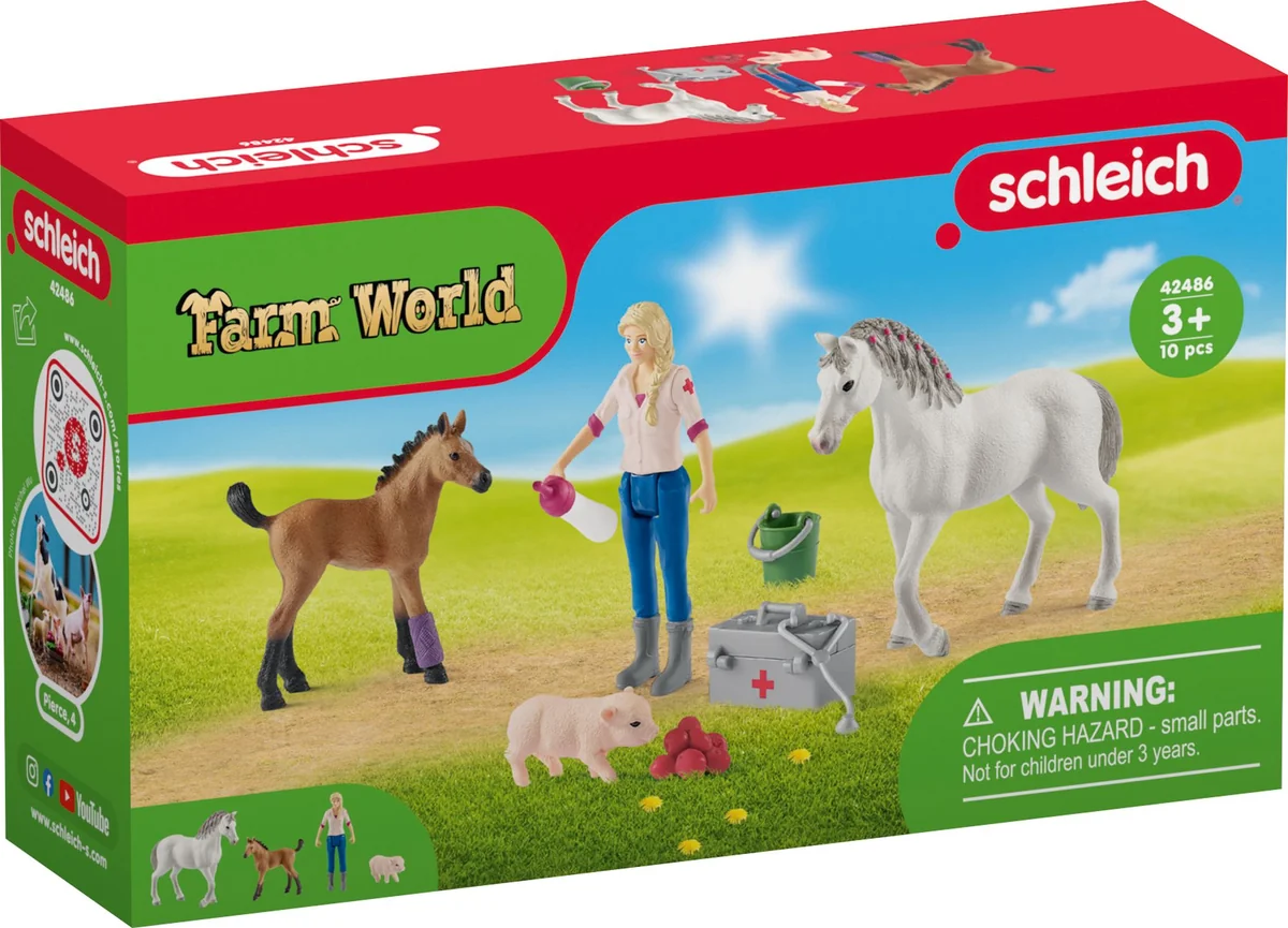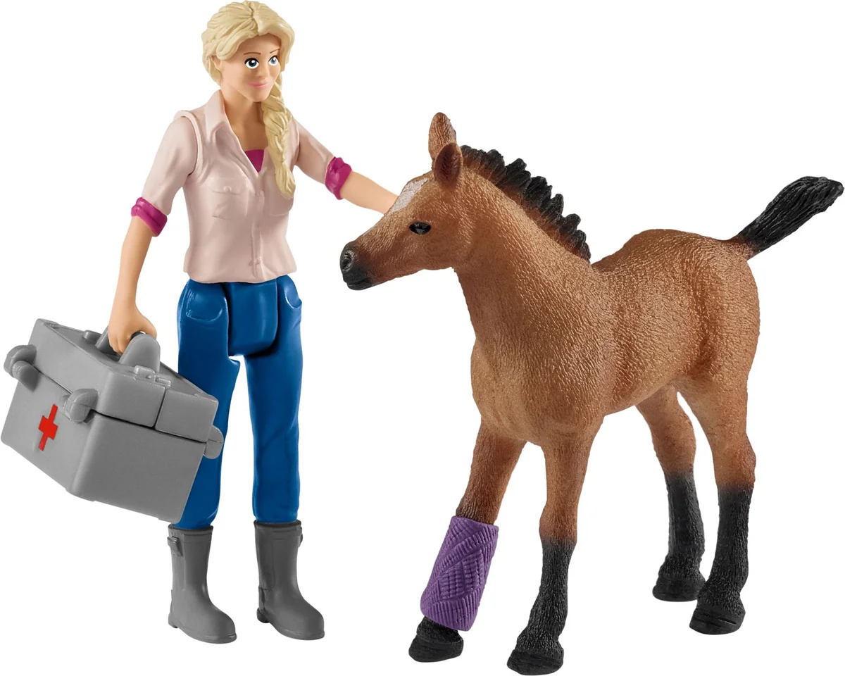 Die Schleich® Figuren sind alle detailgetreu modelliert und stehen für pädagogisch wertvolles Spielen. Tolles Ergänzungsset zum neuen Pferdestall mit 3 süßen Tieren (Stute, Fohlen, Ferkel), Tierärztin und viel Zubehör. Während sich die Tierärztin sich um das Fohlen kümmert und den Verband wechselt, schaut die Stute zu und passt dabei auf, dass ihrem Fohlen nichts passiert.
