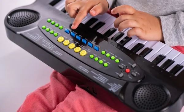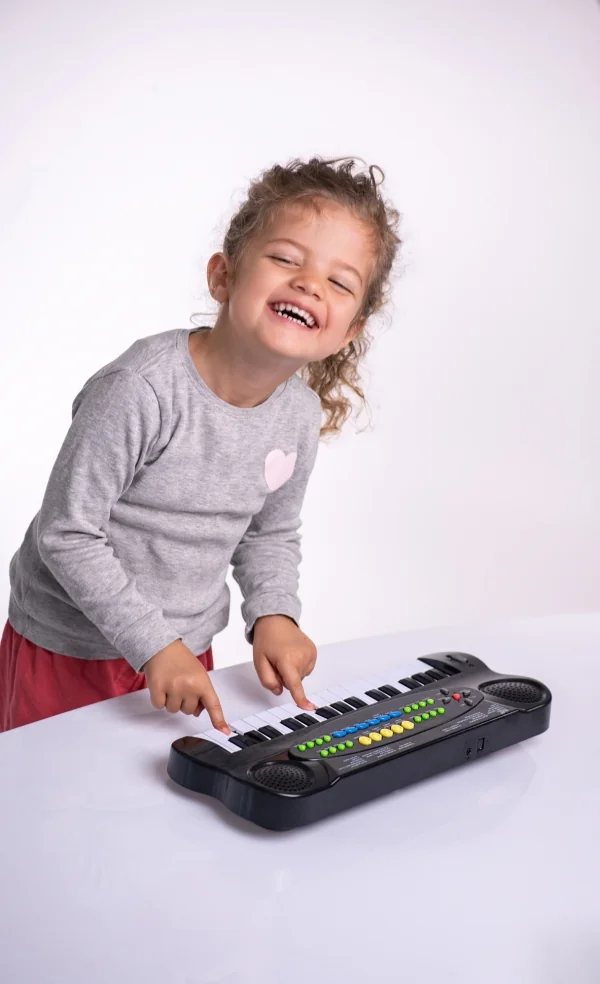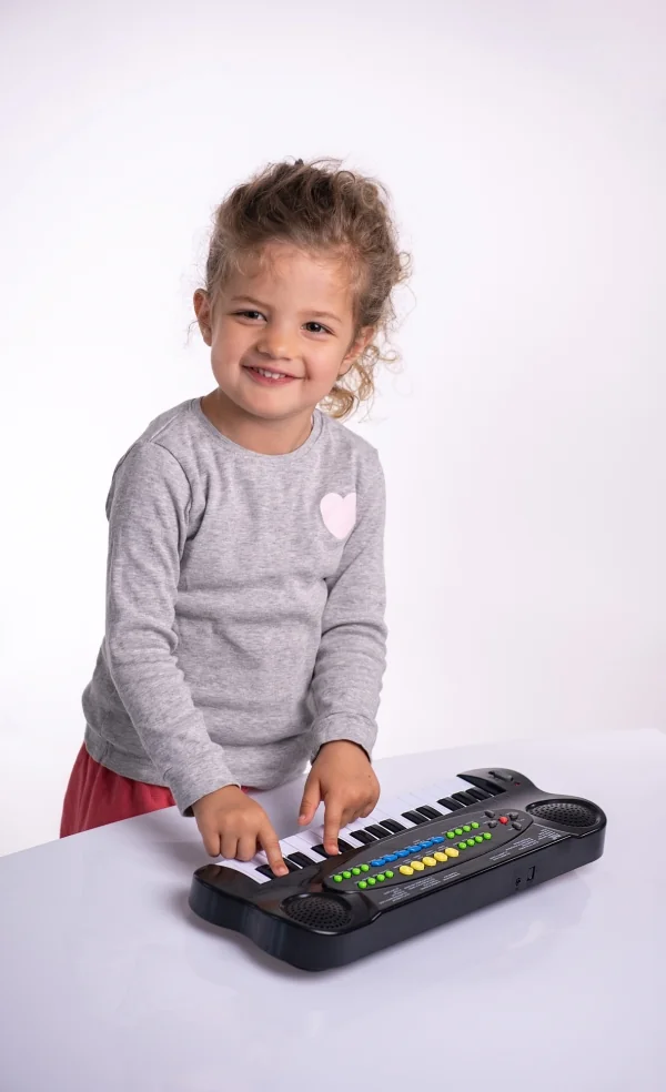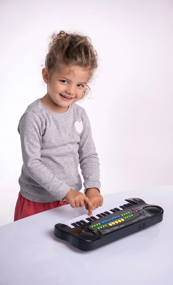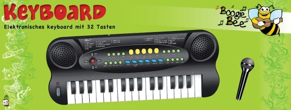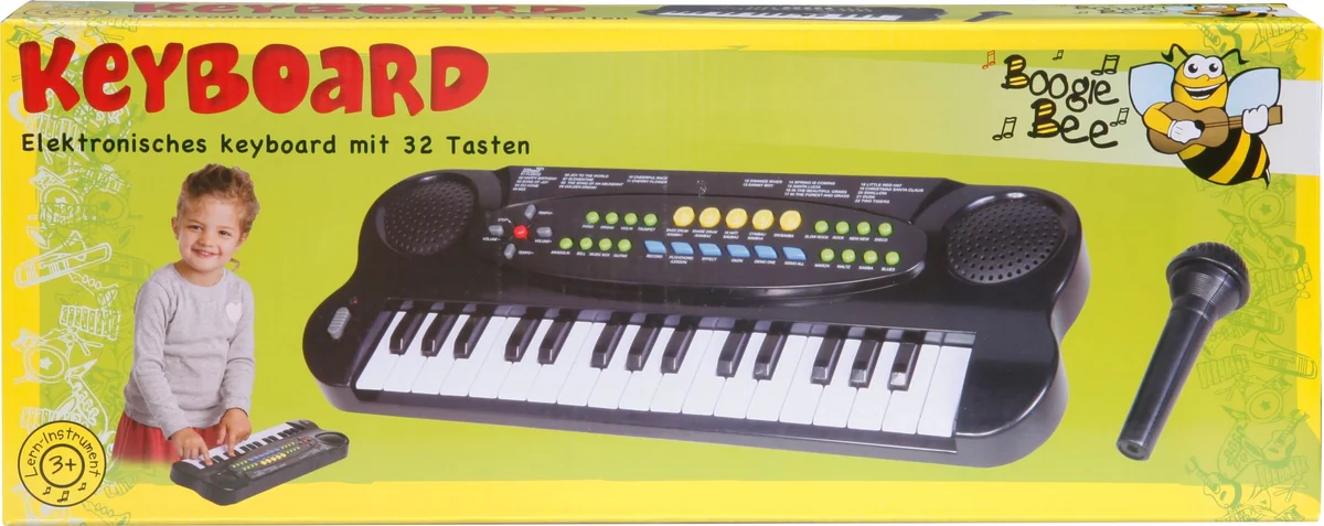 32 Tasten, 22 Demo Songs, 1 Rythmus, 3 Töne, 3 Arten von Percussion Sound, 3 Samba Sounds, Tempo Steuerung, Lautstärkenregelung, externes Mikrofon, automatische Abschaltregelung. Boogie Bee Elektronisches Keyboard mit Mikrofon. Dieses Keyboard ist ausgestattet mit 32 Tasten, 22 Demo Songs, 1 Rythmus, 3 Töne, 3 Arten von Percussion Sound, 3 Samba Sounds, Tempo Steuerung, Lautstärkenregelung, externes Mikrofon, automatische Abschaltregelung. Maße ca. 42,7x5,8x14,6 cm. Batterien 4xAA sind nicht enthalten. Für Kinder ab 3 Jahren.
