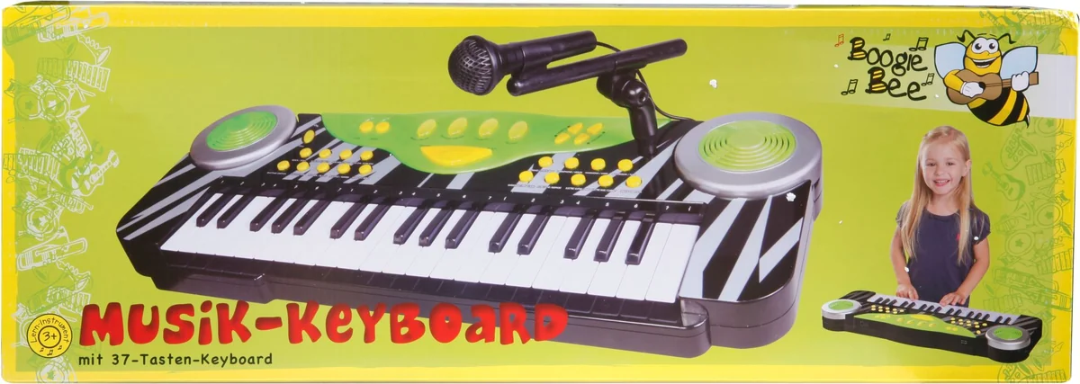 Mit Aufnahme- und Wiedergabefunktion, 8 Demo-Songs, Temposteuerung, Lautstärkeregler, 16 Rhythmen, 4 Arten von Percussion- Sounds und 16 Töne Flash-Funktion. Batterien erforderlich. Ab 3 Jahren. Boogie Bee Elektronisches Keyboard mit externem Mikrofon. Hat eine Aufnahme-und Wiedergabefunktion, 8 Demo Songs, Temposteuerung, Lautstärkenregler, 16 Rythmen, 4 Arten von Perkussion-Sounds, 16 Töne Flash-Funktion. Batterien 4x1,5V AA LR6 sind nicht enthalten. Maße: 59x23,5x5,5cm. Für Kinder ab 3 Jahren.