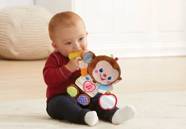 Mit dem kuscheligen Babyäffchen spielen und viel Spaß haben! * 1 leuchtende Herz-Taste * 1 Beißelement unterstützt beim Zahnen * 1 kleiner Spiegel * Verschiedene Oberflächen wie Plüsch, Stoff und Gummi regen den Tastsinn an * 3 gesungene Lieder * 15 Melodien * Bewegungssensor * Kindersicheres Batteriefach und Abschaltautomatik * Demobatterien enthalten