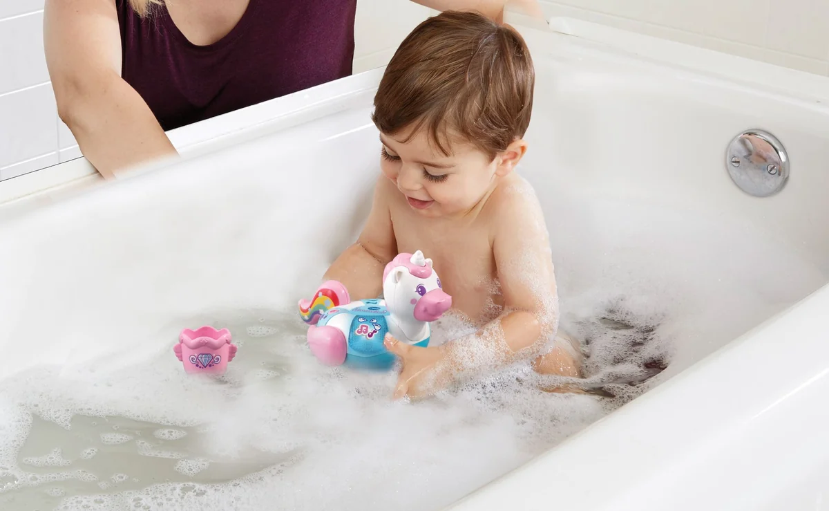 Lustiges sprechendes und singendes Schwimmring-Einhorn zum Spielen in der Badewanne. Inkl. kleinem Eimer zum Wasserschöpfen. Mit leuchtender Taste, die lustige Sätze, Geräusche, Lieder und Melodien auslöst. 3 gesungene Lieder und 15 Melodien. Kindersicheres und wasserdichtes Batteriefach. Abschaltautomatik. Ab 12 Monaten. Mit dem niedlichen Einhorn macht das Planschen besonders viel Spaß! Lustiges sprechendes und singendes Schwimmring-Einhorn zum Spielen in der Badewanne. Inkl. kleinem Eimer zum Wasserschöpfen. Das Badespielzeug besitzt eine leuchtende Taste, die lustige Sätze, Geräusche, Lieder und Melodien auslöst. 3 gesungene Lieder und 15 Melodien. Kindersicheres und wasserdichtes Batteriefach. Abschaltautomatik. Demobatterien enthalten