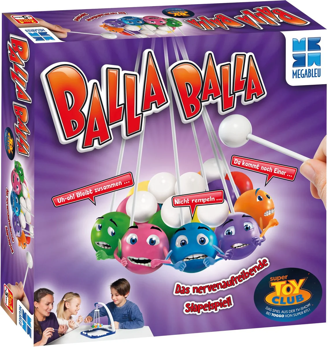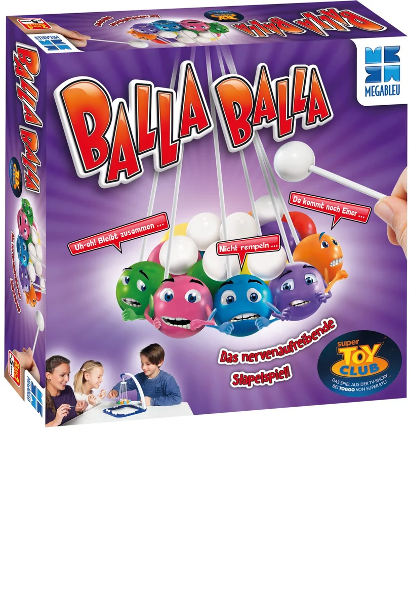 Geschicklichkeitsspiel. Für 2-4 Spieler. Ab 5 Jahren. Die bunten Ballas hängen cool ab und halten immer fest zusammen. Die Spieler platzieren Runde um Runde ihre weißen Kugeln auf der Ballas-Traube und jede weitere Kugel erhöht den Druck auf die Ballas.Irgendwann geht der Zusammenhalt flöten und alles purzelt auf den Spieltisch.Wer nicht aufpasst, verursacht einen wahren Kugelhagel und riskiert von seinen Mitspielern ein schadenfrohes ''Balla Balla!