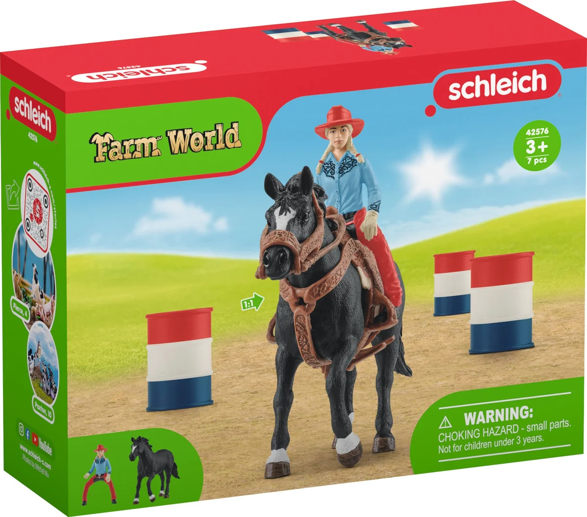 Die mitreißende Rodeodisziplin Barrel Racing lässt deine Haare nur so fliegen also, schwing dich in den Sattel! Das Spielset ''Barrel Racing mit Cowgirl enthält einen Appaloosa Hengst, eine Cowgirl-Figur, drei Fässer sowie einen Westernsattel, Zügel und Zaumzeug. Nimm die Zügel fest in die Hand und klemm deine Füße in die Steigbügel das Spielset eignet sich für kleine Rodeofans ab 3 Jahren.