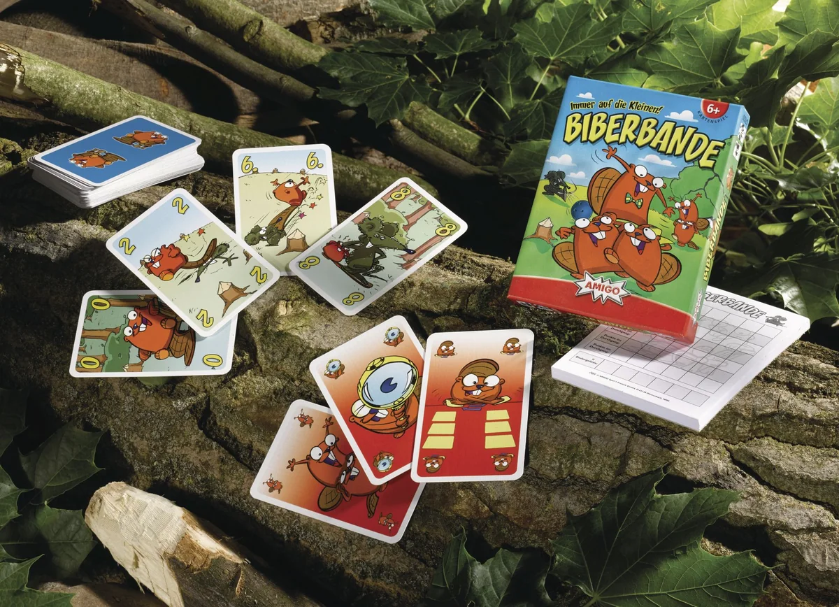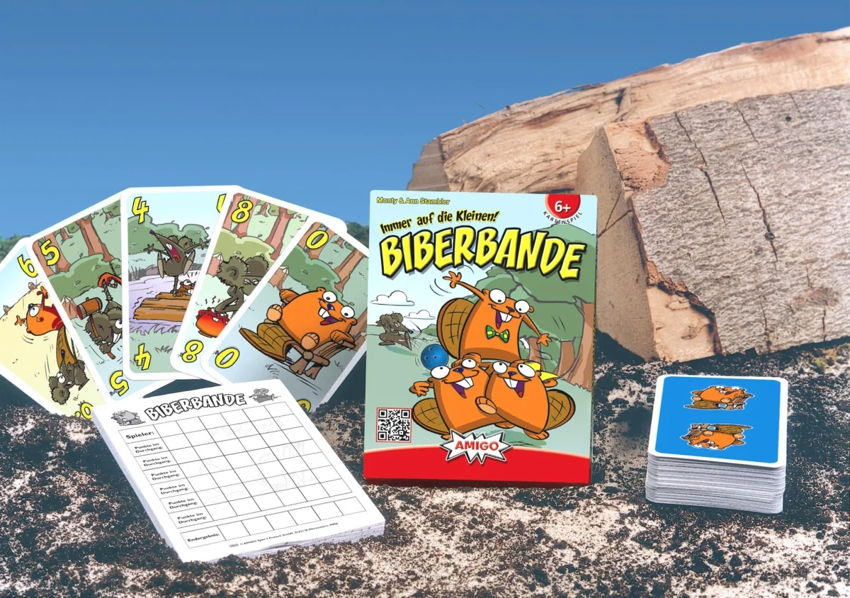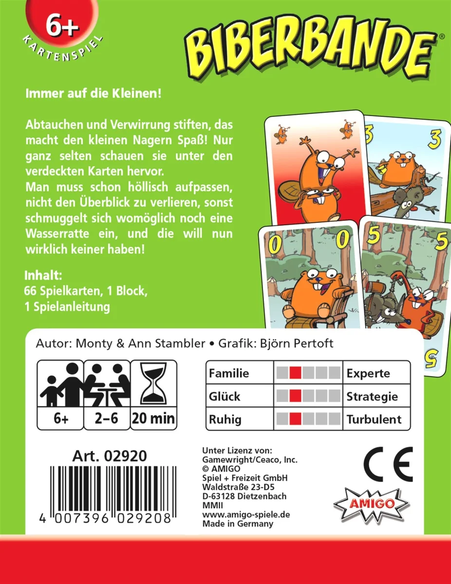 Immer auf die Kleinen Die Biber lassen es sich so richtig gut gehen, sie nagen genüsslich an einem Baumstamm und bauen an ihrem Damm. Doch plötzlich flitzt eine graue Wasserratte vorbei, und da hinten noch eine ... Möglichst wenig Karten mit den fiesen Wasserratten zu bekommen, ist das Ziel dieses witzigen Kartenspiels. Jeder Spieler hat vier Karten verdeckt vor sich auf dem Tisch liegen, nur zwei davon darf er sich zu Beginn ansehen. Von da an gibt es nur noch wenige Möglichkeiten, um herauszufinden, was auf der Vorderseite abgebildet ist. Ist es ein dösender Biber mit niedrigem Zahlenwert oder eine fiese Wasserratte mit hohem Wert, die den Bibern zu schaffen macht? Denn diese kleinen grauen Nager sollte man möglichst schnell loswerden. Spezielle Sonderkarten erlauben es, sich während des Spiels die ein oder andere Karte anzusehen oder eine schlechte Karte seinen Mitspielern zuzuschieben. Am Ende einer Spielrunde werden alle Karten aufgedeckt und die Zahlenwerte der Karten notiert. Wer nach mehreren Runden die wenigsten Punkte hat, gewinnt dieses witzige Kartenspiel und hat es verdient, sich den Rest des Tages mit seinen Biberfreunden von den Kabbeleien mit den Wasserratten zu erholen. Inhalt: 66 Spielkarten, 1 Block, Spielanleitung Biberbande MBE3 Biberbande - Der clevere Kartentausch Abtauchen und Verwirrung stiften, das macht den kleinen Nagern Spaß - inzwischen schon seit über 20 Jahren! Immer nur ganz kurz schauen sie unter den verdeckten Karten hervor und schon sind sie wieder verschwunden. Da werden schwuppdiwupp die Plätze getauscht, mal hierhin, mal dorthin. Wo eben noch ein Biber lag, lauert mit einem Mal 'ne fiese Wasserratte - und die will nun wirklich niemand haben! So spielt man Biberbande MBE3: Ihr habt jeweils vier verdeckte Karten vor euch liegen. Die beiden äußeren Karten dürft ihr euch anschauen, um euch deren Werte zu merken. Ihr versucht, Karten mit niedrigen Werten vor euch liegen zu haben und hohe Werte loszuwerden. Reihum zieht ihr jeweils eine Karte. Entweder werft ihr die Karte ab oder ihr tauscht sie gegen eine eigene, verdeckte Karte aus. Sonderkarten bringen zusätzliche Aktionen: unter eine eigene Karte spähen, zweimal vom Stapel ziehen oder eine eigene Karte mit einer anderen Person tauschen. Wer der Meinung ist, dass die eigenen Werte niedrig genug sind, ruft die letzte Runde aus. Danach deckt ihr eure Karten auf und zählt die Werte zusammen. Wer nach mehreren Durchgängen die wenigsten Punkte hat, gewinnt. Inhalt: * 66 Spielkarten * 1 Block * 1 Spielanleitung Maße: 12,3 x 9,7 x 2,2 cm Autor: Monty & Ann Stambler Grafik: Björn Pertoft Erfolgsfaktoren: * kurzweiliges, lustiges Kartenspiel * geeignet für generationsübergreifendes Spielen * Memo-Spiel mit Kniff (man kann auch herrlich die Mitspielenden ärgern) * seit über 20 Jahren erfolgreich am Markt * beliebtes Spielprinzip (ähnlich Skyjo und Capo)