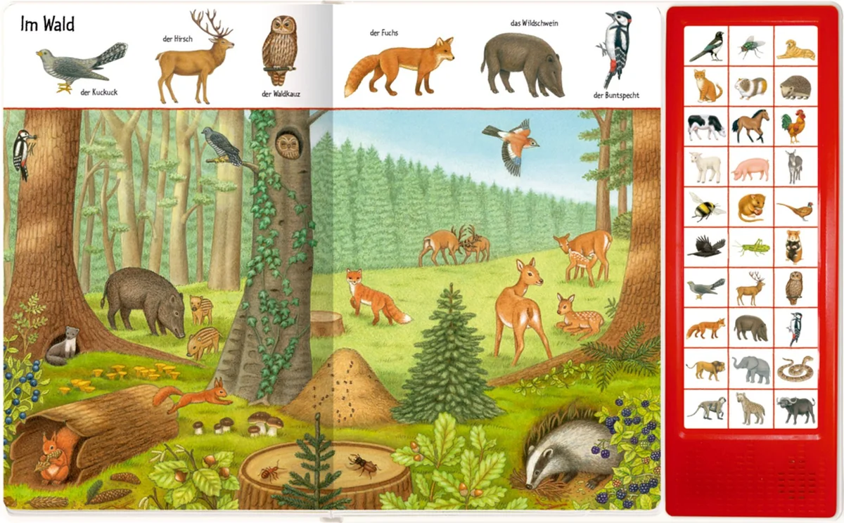 Das ist der Specht. Er macht tock, tock. Das ist das Wildschwein und es macht grunz, grunz. Aber wo ist der Hirsch? Und wie hört er sich an? 30 Tierabbildungen können benannt und in den großen Bildern gesucht werden. Und durch einen Druck auf das gleiche Bild auf der Soundleiste, ist auch das jeweilige Geräusch zu hören. Das ist der Specht. Er macht tock, tock. Das ist das Wildschwein und es macht grunz, grunz. Aber wo ist der Hirsch? Und wie hört er sich an? 30 Tierabbildungen können benannt und in den großen Bildern gesucht werden. Und durch einen Druck auf das gleiche Bild auf der Soundleiste, ist auch das jeweilige Geräusch zu hören.