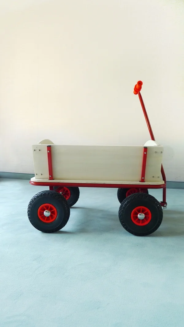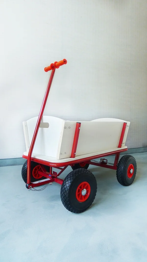 Bollerwagen mit Feststellvorrichtung, aus mehrfach verleimtem und zweifach lasiertem Nadelholz, pulverbeschichtetes Stahlrohrgestell, PU- Räder, Max. Zuladung 80kg. Bollerwagen Bubi mit Festellbremse, aus mehrfach verleimten und zweifach lasiertem Nadelholz, pulverbeschichtetes Stahlrohrgestell, PU-Räder mit Rollenlager, Maße: 88 x 60 x 56 cm (L x B x H). Gewicht ca. 17,5 kg. Max. Zuladung: 80 kg. Ab 3 Jahren.