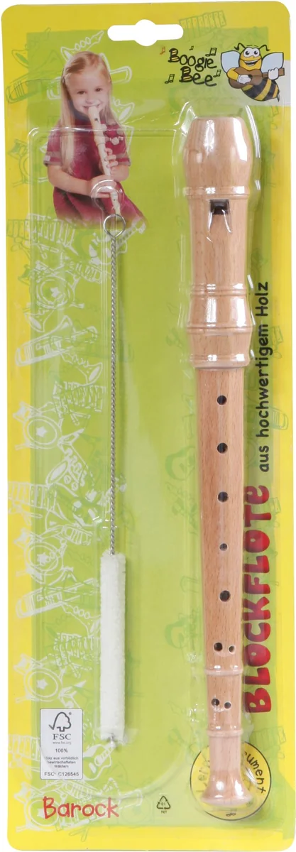 Boogie Bee Blockflöte aus Holz. Griffweise Barock. Länge ca. 32 cm. Inklusive Flötenputzer. Auf Blisterkarte. Kartengröße: 13.5x39.5cm. Für Kinder ab 3 Jahren.