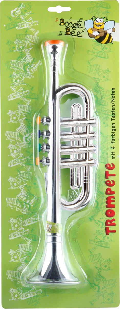Mit 4 Tasten. Länge ca. 38 cm. Ab 3 Jahren. Boogie Bee Trompete silber, mit 4 Tasten. Länge ca. 38 cm. Auf Blisterkarte. Kartengröße: W190 x H480mm. Für Kinder ab 3 Jahren.