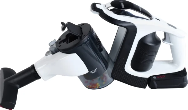 Mit drehbarem Fuß, entnehmbarer Bodendüse, Rohr und Staubsaugergeräuschen. Inkl. Styroporkügelchen und zusätzlicher Düse. Maße ca. 16x16x80 cm. Batterien erforderlich. Ab 3 Jahren. ''Bosch Staubsauger UNLIMITED'''' - Spielzeug mit kindgerechten Funktionen - mit Wirbelfunktion der Kügelchen innerhalb des Staubbehälters - batteriebetrieben - mit drehbarer und entfernbarer Bodendüse inklusive Laufwalze - Laufrollen an der Unterseite der Düse - mit entnehmbarem Staubbehälter zum Entleeren der beiliegenden Kügelchen - mit zusätzlicher Handdüse - Geeignet für Kinder ab 3 Jahren''''''