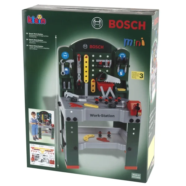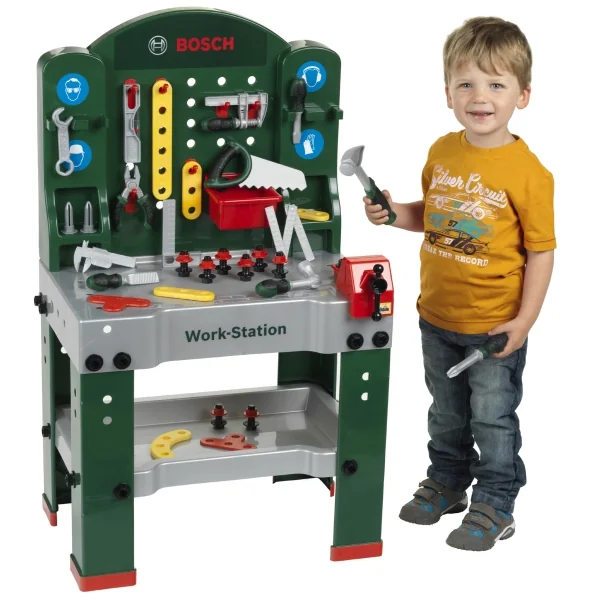 Mit vielen Spielmöglichkeiten und realistischen Funktionen. Arbeitsplatte mit Lernfunktion, Schraubstock, Schrauben, Muttern, Latten u.v.m.. Maße ca. 61x44,5x101 cm. Ab 3 Jahren. Bosch 44 - teilige Work-Station - Arbeitsplatte mit Lernfunktion - Maße der Werkbank (L x B x H): 61 x 44,5 x 101 cm - Work-Station im Bosch Design Werkbank mit zahlreichem Zubehör: Schlitz- und Kreuzschlitzschraubendreher, Schraubenschlüssel, Ratsche, Zange, Feile, Hammer, Säge, Waage, Winkel, Metermaß und Schraubzwinge, Schraubstock, Ablagekasten, Aufhängehaken, Schrauben, Muttern und Schraubelemente in verschiedenen Größen und Formen - Geeignet für Kinder ab 3 Jahren - Made in Germany
