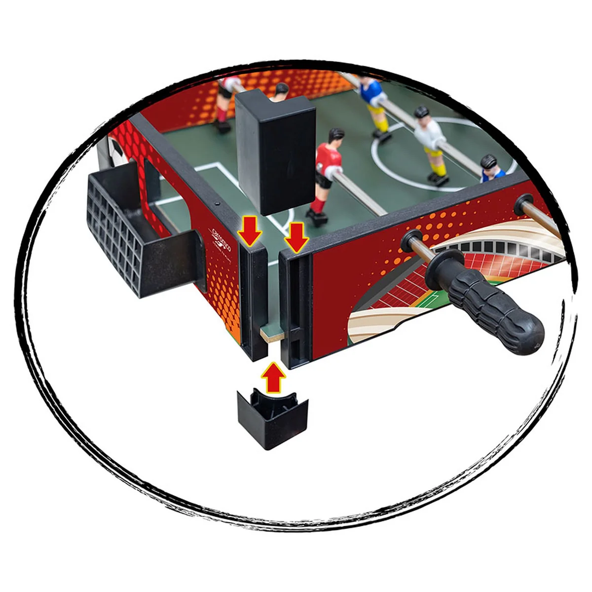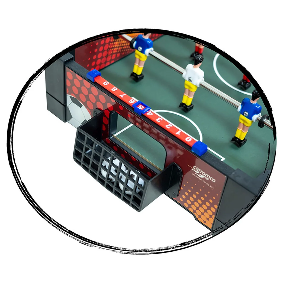 Der CARROMCO KICKER FAST-KICK-XM, ist ein kleiner Kickertisch als Tischauflagemodell. * farbenfrohes Design * einfacher Aufbau durch Stecksystem * 7 mm Stangen mit Schutzkappen * 12 Spieler / 6 pro Team * Spielerfarben: rot-schwarz, gelb-blau * Torhüter in anderen Farben * Ballrücklauf an Kopfseite * manuelle Torezähler aus Kunststoff Zubehör: 2 Bälle Ausführung: Bausatz Maße: 51 x 31 cm, Höhe: 9,7 cm Gewicht: 1,8 kg ARTIKEL NUR FüR DEN PRIVATEN HAUSHALT - NICHT FüR EINRICHTUNGEN ETC. GEEIGNET!.Achtung! Dieser Artikel wird direkt vom Hersteller geliefert.