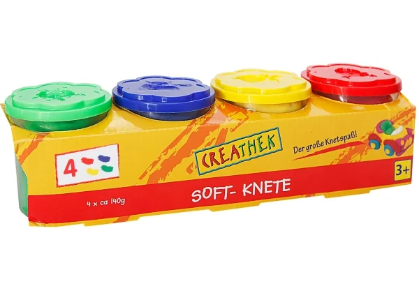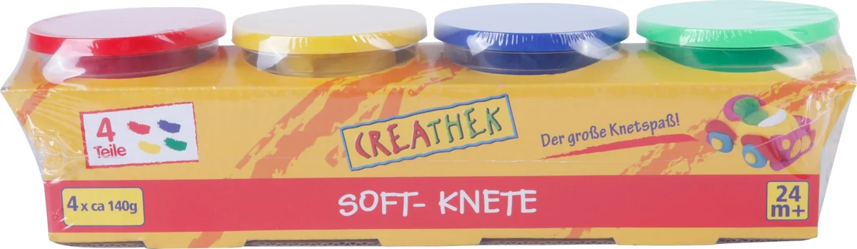 Inhalt: 4 Dosen Softknete in unterschiedlichen Farben: rot, gelb, blau und grün. Inklusive Förmchen im Deckel der Dosen. Inhalt je Dose: ca. 140 g. Für Kinder ab 24 Monaten. Creathek Knete 4er Set Grundfarben mit insgesamt 560g. Inhalt je Dose ist ca. 140g. Das Set beeinhaltet 4 Dosen in unterschiedlichen Farben wie Rot, Gelb, Blau und Grün. In dem Deckel der Dosen sind kleine Förmchen eingearbeitet. Für Kinder ab 24 Monaten.