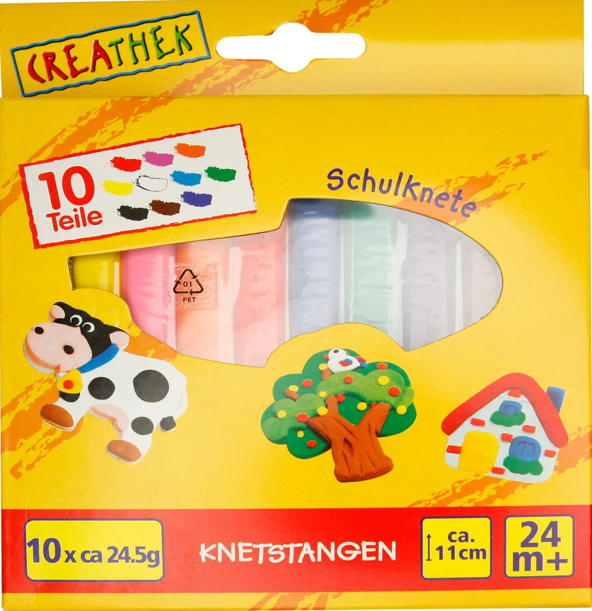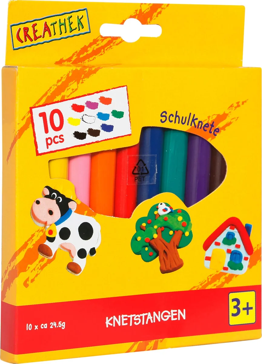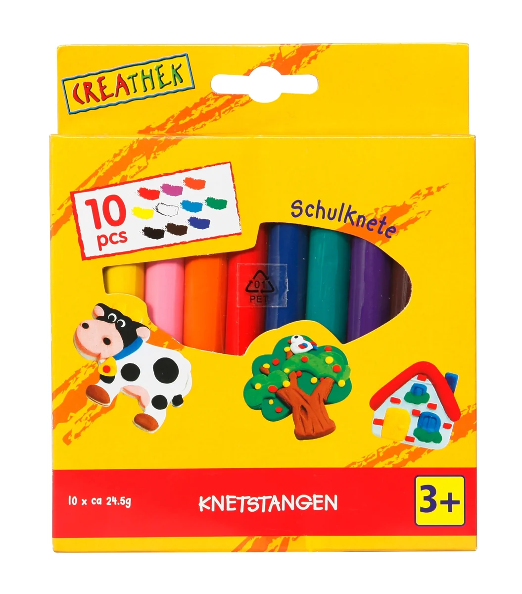 Set beinhaltet 10 Knetstangen in verschiedenen Farben. Gesundheitlich unbedenklich und leicht abwaschbar. Für Kinder ab 24 Monaten. Creathek Schulknete 10 Stangen in verschiedenen Farben wie Weiß, Gelb, Orange, Pink, Rot, Blau, Grün, Lila, Braun und Schwarz. Eine Stange hat eine Länge von ca. 11 cm. Für Kinder ab 24 Monaten.