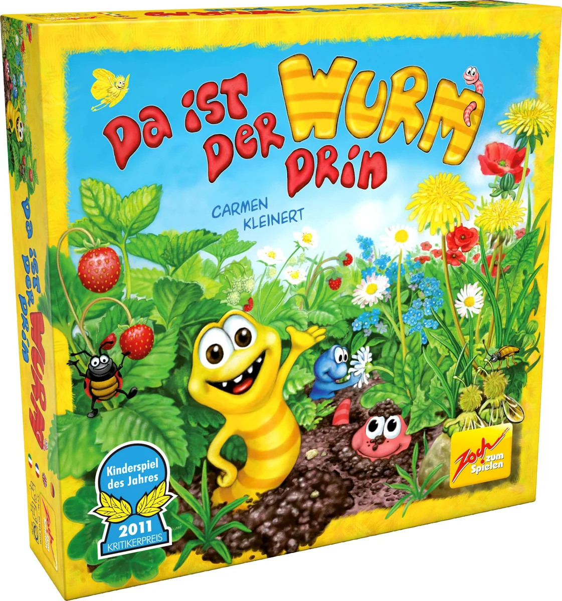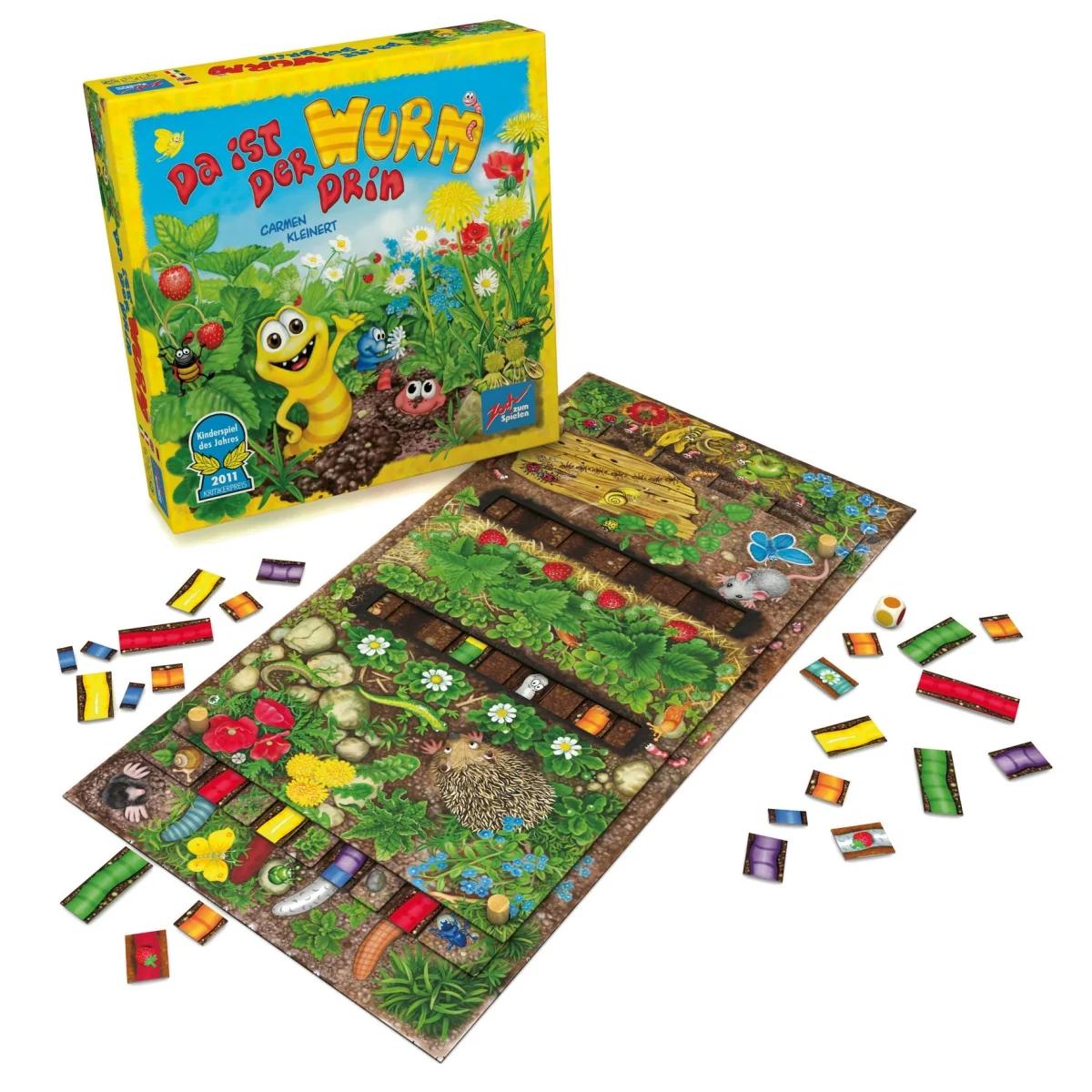 Kinderspiel. Für 2-4 Spieler. Ab 4 Jahren. Kinder- und Familienspiel Kinderspiel des Jahres 2011. Bei der Buddelrallye durch Nachbars Garten lässt jeder Spieler einen Wurm im Erdboden des dreilagigen Spielplanes verschwinden. Mit dem Farbwürfel ermitteln die Spieler bei jedem Spielzug, wie lang sich der eigene Wurm beim Graben machen darf. Wer auch die Würmer der Mitspieler aufmerksam beobachtet, kann schon vorab richtig abschätzen, welcher Wühler unterwegs zuerst am Guckloch des Blumen- und Erdbeerbeets auftaucht. Zur Belohnung darf dann der eigene Wurm noch schneller graben, um als Erster am Ziel sein siegreiches Köpfchen aus dem Erdreich zu recken. Der Blick in die Sichtschlitze des Spielplanes sorgt für unvergessliche Überraschungsmomente, die dem kindlichen Selbstbewusstsein Stärke verleihen und auch Erwachsene mitfiebernd ins Staunen versetzen. Für 2-4 Spieler ab 4 Jahren. Material: 1 großer Spielplan, 1 kleiner Spielplan mit Sichtschlitzen, 4 Steine zur Befestigung der Spielpläne, 60 Wurmteile (6x10 Stück in 6 Farben und 6 Längen), 1 Farbwürfel, 4 Wurmköpfe, 4 Erdbeeren, 4 Gänseblümchen, 1 Spielanleitung