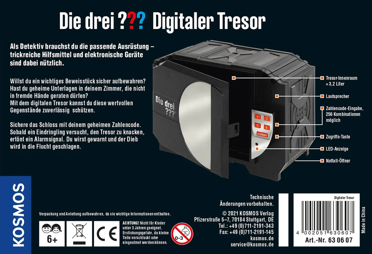 Mit einem 4-stelligen Zahlencode kann man den Safe öffnen. Bei unbefugtem Zugriff ertönt ein Alarm. Inkl. LED-Anzeige. Batterien erforderlich. Ab 6 Jahren. Nicht nur die drei Detektive aus Rocky Beach, Justus Jonas, Peter Shaw und Bob Andrews, brauchen einen sicheren Aufbewahrungsort für geheime Dokumente, wichitge Indizien und gesicherte Beweise. Auch Nachwuchs-Detektive ab acht Jahren müssen vertrauliche Dinge vor unbefugtem Zugriff schützen! Im Digitalen Tresor sind alle Geheimnisse sicher, denn er kann nur mit einem selbst einstellbaren, vierstelligen Code geöffnet werden. Wenn Diebe am Werk sind ertönt ein Alarm, der den Besitzer auf den Plan ruft. So kann der Einbrecher schnell gefasst werden - Fall gelöst!