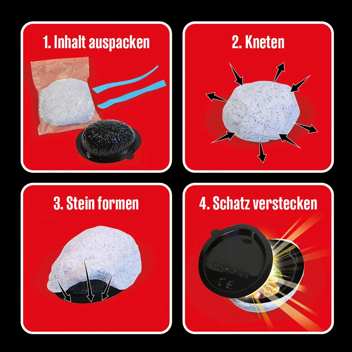 Einen sichereren Ort für streng geheime Botschaften, einen Schlüssel oder einen wertvollen Schatz gibt es nicht! Das Die drei ??? Geheimversteck verbirgt sich an der Unterseite eines Steins aus lufttrocknender Knetmasse. Bevor das Detektivspiel beginnt stellen Nachwuchs-Detektive ab 8 Jahren selbst ihr ganz eigenes Versteck selbst her: Die Kinder drücken die Knetmasse auf eine Form und modellieren den Stein möglichst realistisch. Unauffällig bleibt er so vor neugierigen Augen im Kinderzimmer oder Garten verborgen. Einfach der anschaulichen Anleitung folgen, die zeigt, wie sich der Stein mit dem Modellierwerkzeug bearbeiten lässt und das Geheimfach geschlossen wird. Justus, Peter und Bob wären begeistert: Dieses Versteck findet garantiert keiner!