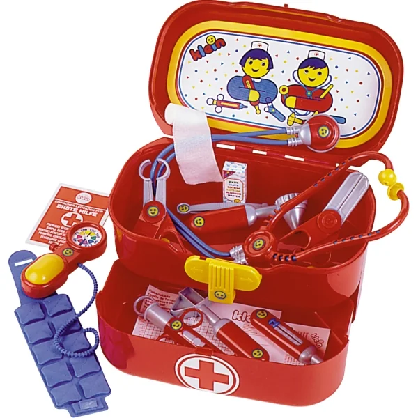 Arztkoffer - Robuster Koffer mit praktischem Tragegriff Mit zahlreichem Zubehör: Elektronischem Blutdruckmesser mit Sound, Stethoskop, Thermometer, Reflexhammer, Spritze, Pinzette, Ohrenspiegel, 2 Scheren, Pflaster, Erste Hilfe Tipps, Watteschächtelchen, Fiebertabelle und Rezeptkarte - Geeignet für Kinder ab 3 Jahren - Made in Germany