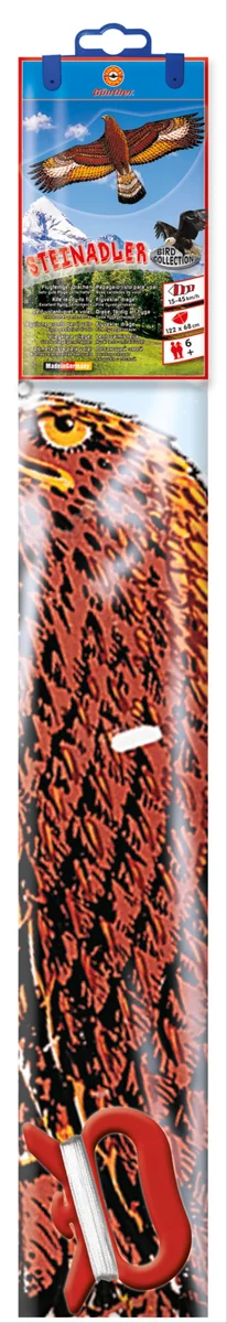 Kinderdrachen Steinadler. Segel aus Polyethylenfolie. Komplett mit Wickelgriff und Schnur. Größe: ca. 122 x 68 cm. Wind: 15 - 45 km/h.Geeignet ab 4 Jahren. Kinderdrachen Steinadler mit Segel aus Polyethylen und unzerbrechlichen Fiberglasstäben. Mit einstellbarer Drachenwaage für unterschiedliche Windgeschwindigkeiten. Komplett mit Wickelgriff und Schnur. Maße: ca. 122 x 68 cm. Ab 4 Jahren.