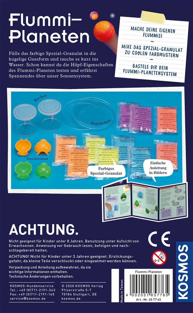 Wie cool ist das! Mars, Jupiter, Venus, Saturn mit den bunten Flummi-Planeten erschaffen Kinder ihr erstes springendes Universum. Die Anleitung zeigt ihnen, wie sie Schritt für Schritt zu ihren hüpfenden Springbällen kommen. Schnell die verschiedenen Farbgranulate in die speziellen Planeten-Gussformen gießen, für einige Minuten ins Wasser tauchen, herausnehmen und kurz trocknen lassen. Schon können die Flummis getestet werden! Tipps und Tricks erklären, wie sich tolle Muster mischen lassen, Planetenringe gegossen und aus den getrockneten Bällen ein Flummi-Mobile gebastelt wird. Kleine Zusatzinfos liefern spannende Fakten zum Sonnensystem sowie zu echten und hüpfenden Planeten. Unser Tipp: Etwas Granulat für später aufheben, um den Hüpfespaß zu verlängern. Da wir auf Zusatzstoffe verzichtet haben, verlieren die Flummis nach ein bis zwei Tagen ihre Sprungkraft.
