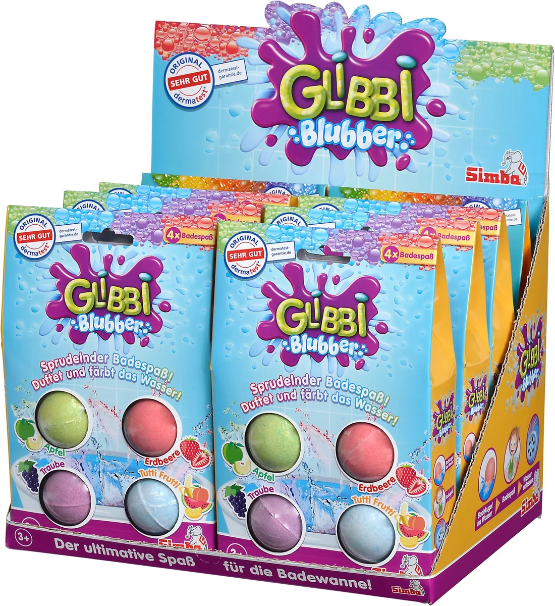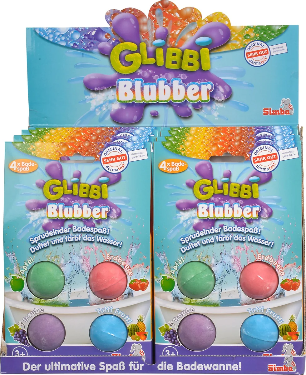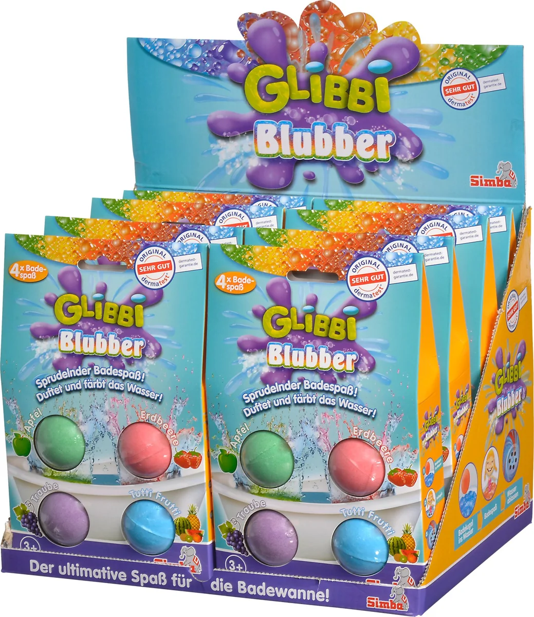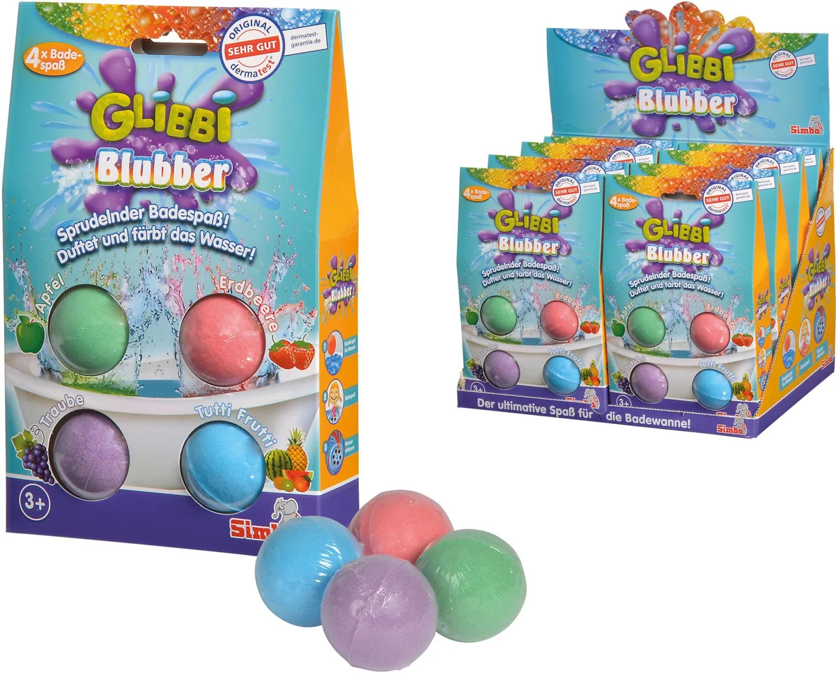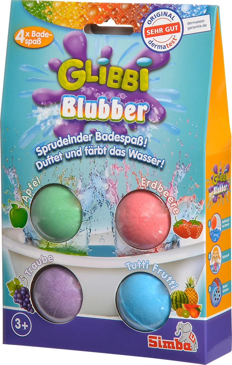 Die Badekugeln lassen das Wasser lustig sprudeln und färben das Wasser, 4 verschiedene Farben und Düfte. Ab 3 Jahren Glibbi - der ultimative Spaß für die Badewanne. Mit den vielseitigen Glibbi Produkten von Simba Toys kommt garantiert keine Langeweile in der Badewanne auf. Ob sprudelndes buntes Wasser, glibberiger Glibber oder herrlicher Schleim - die Auswahl ist riesig. Sprudeln und färben das Wasser - einfach eine der vier bunten Badekugeln in das Wasser werfen und sogleich beginnen diese zu sprudeln und färben das Badewasser bunt ein. Mit Duft - jede Badekugel besitzt einen anderen Duft. So wird entweder ein leckerer Apfel- , ein fruchtiger Erdbeer-, Brombeer- oder Tutti Frutti-Duft im Badezimmer verbreitet. Simba - Elefantenstarker Spielspaß! Im Zentrum der Produktentwicklung steht die Begeisterung der Kinder. Für Jungen und Mädchen, Klein und Groß. Kinder sollen Spaß haben und gefördert werden.