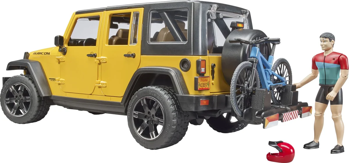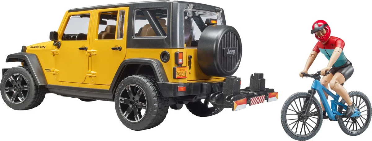 Fahrradfahren erlebt einen breiten Zuspruch. Für viele Menschen bedeutet dieser Sport Erholung vom stressigen Alltag draußen in der Natur. Auch bei BRUDER macht sich der Fahrrad-Boom bemerkbar. Die neu entwickelte bworld Figur im top modernen Fahrrad Outfit ist sportlich mit dem ebenfalls neuen BRUDER Mountainbike unterwegs. Um die schönste Mountainbike-Strecken zu erreichen, steht mit dem Jeep Wrangler Rubicon Unlimited ein echtes Offroad Talent zur Verfügung. Neben dem 2-teilig abnehmbaren Segmentdach lassen sich auch die Motorhaube, die Hecktür und alle vier Türen öffnen. Selbstverständlich sind die Platzverhältnisse so, dass auch vier BRUDER Figuren in das Fahrzeug passen. Alternativ zu der Vollbesetzung ist die Rücksitzbank herausnehmbar, um dann im Ladebereich über die BRUDER-Normverbinder Zubehör aufnehmen zu können. Die Zusatzlenksäule dient dem einfachen Lenken durch die Dachluke und kann bei Nichtverwendung im Fahrzeugboden verstaut werden. Die Achsen sind geländewagenüblich gefedert und die profilierten Räder besitzen verchromte Felgen in attraktiver SUV-Optik. Das Mountainbike kann bequem auf dem mitgelieferten Fahrradträger montiert werden, der auf der Anhängerkupplung befestigt ist. Die passende Erweiterung für dieses Set ist die bworld Fahrradfahrerin mit Mountainbike (Art.-Nr. 63111).