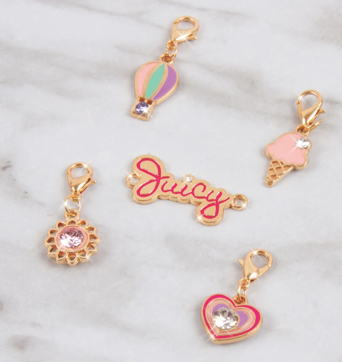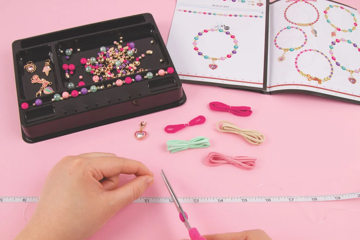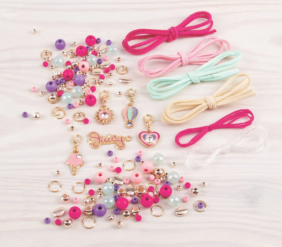 Dieses Schmuckset enthält alles, was man braucht, um den eigenen Juicy Couture-Schmuck herzustellen. Mit wunderschönen bunten Swarovski-Kristallen sind die Armbänder ein echter Hingucker! Das Set enthält 157 verschiedene Perlen, 1 rosafarbenen Baumwollfaden, 20 Sprungringe, 1 elastische Kordel, 4 bunte Wildlederimitat-Spitze. Das hochwertige Set enthält Swarovski-Kristalle. Für wunderschöne Designs, die am Handgelenk bezaubern. Das Schmuckset eignet sich prima für Mädelsnachmittage, Kindergeburtstage oder als Geschenk!