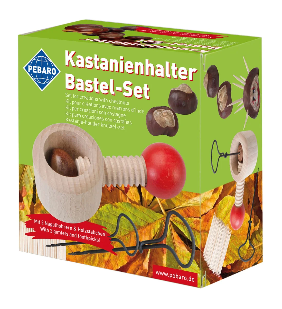 INHALT: Kastanienhalter 2 Nagelbohrer (2mm + 3mm) 190 Zahnstocher - ANWENDUNG: Mit unserem Kastanienhalter Bastel-Set gestalten Sie ganz einfach lustige Tiere und Kastanienmännchen. Die Kastanien werden in den Schraubstock gespannt und schon können ganz einfach Löcher in die Kastanie gebohrt werden. Zahnstocher werden hineingesteckt und so entstehen die Arme und Beine der Figuren. Das Kastanienhalter Bastel-Set ist somit besonders gut für Kinder geeignet.