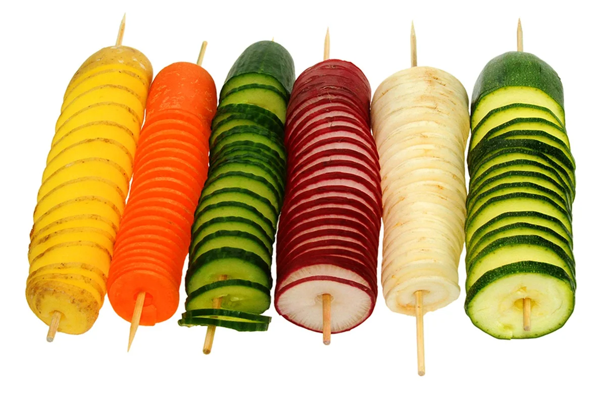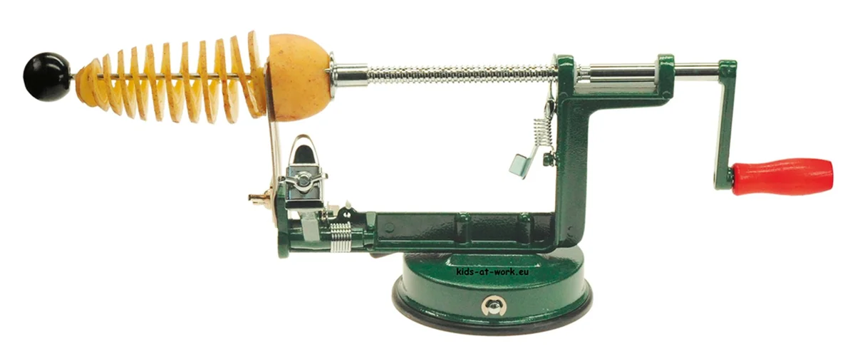 Kartoffeln werden in dünne Spiralen geschnitten. Anschließend frittiert oder in der Mikrowelle zubereitet. Funktioniert auch mit Gemüse. Kartoffeln werden in dünne Spiralen geschnitten. Anschließend frittiert oder in der Mikrowelle gechipt. Geniale Sache! Mit Gemüse funktioniert das natürlich auch.