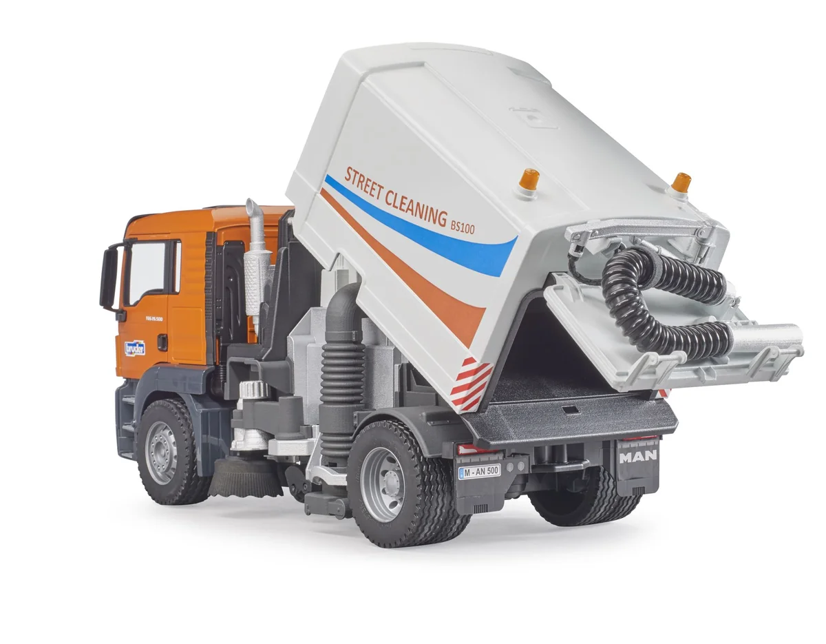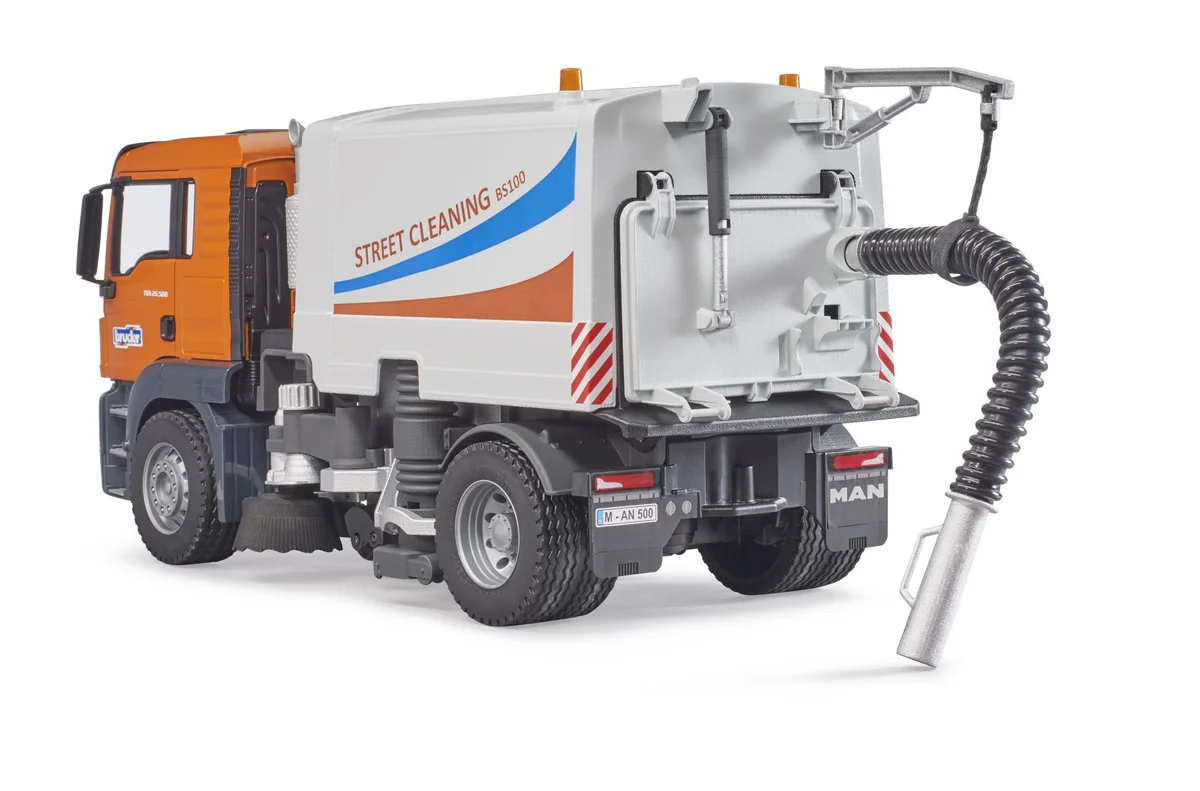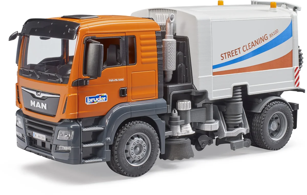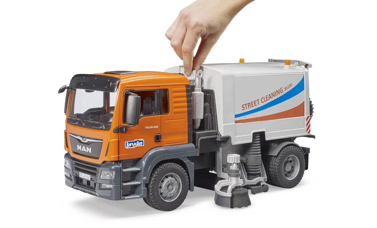 Die Kehrmaschine besitzt zwei rotierende und verstellbare Reinigungsbürsten und eine rotierbare Langbürste, die bei der Fahrt angetrieben wird. Der Abfallbehälter ist kippbar und die Heckklappe zum Öffnen. Länge ca. 47 cm. Ab 4 Jahren. Straßenreinigungen sind ein unverzichtbarer Helfer für jede Stadtverwaltung und gehören zum alltäglichen Stadtbild. Kein anderes Fahrzeug sorgt so effizient für saubere Straßen und Gehwege. Die neue Straßenreinigung von BRUDER zeigt in höchstem Maße detailgetreu die Funktionsweise dieses spannenden LKWs. Der MAN TGS ist der perfekte Partner. Robust gebaut, mit durchzugsstarken Motoren mit bis zu 500 PS ausgestattet und mit einer überdurchschnittlichen Nutzlast ist dieser LKW der Prototyp für den viel beschriebenen Alleskönner. Der Kehrmaschinenaufbau besitzt 2 rotierende und verstellbare Reinigungsbürsten die auch in der Höhe anpassbar sind. Damit erreichen sie auch schwer zugängliche Bereiche. Für die Reinigung von Flächen ist unter dem Fahrzeug eine Langbürste montiert, welche bei der Fahrt angetrieben wird. Am Heck befindet sich der flexible Schlauch samt Saugrohr zur Aufnahme größerer Mengen Schmutz. Zur Entleerung des Abfallkorpus, lässt sich dieser einfach kippen und die Heckklappe öffnen. Im gekippten Zustand zeigt sich auch die beeindruckende Sauganlage des Fahrzeugs. Optional kann die Straßenreinigung mit einem Light & Sound Modul ausgestattet werden (Art.-Nr. 02801 / 02802). Aus der umfangreichen bworld Themenwelt können Kinder den bworld Kommunalarbeiter (Art.-Nr. 62130) wunderbar dazu kombinieren, da dieser den Spielwert nochmals eindrucksvoll erweitert.