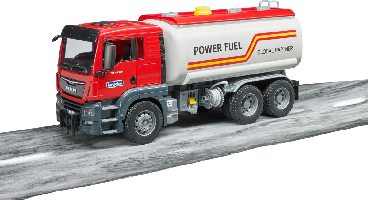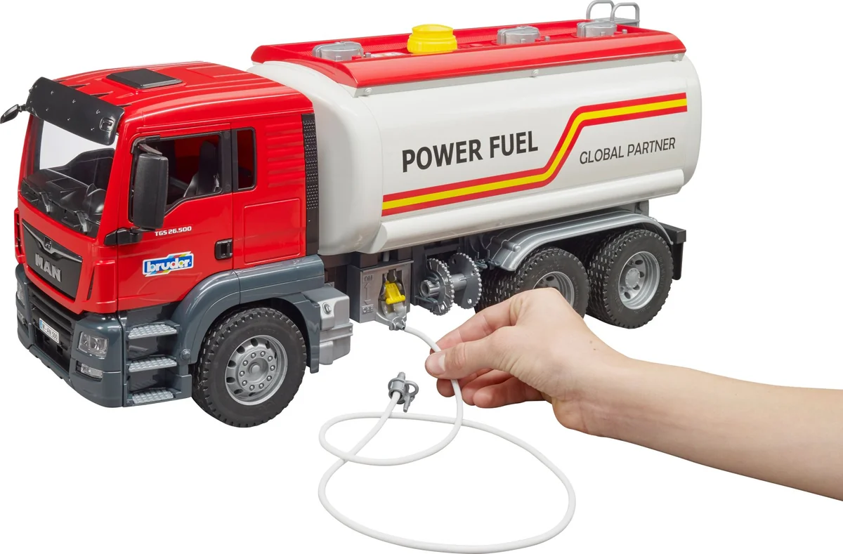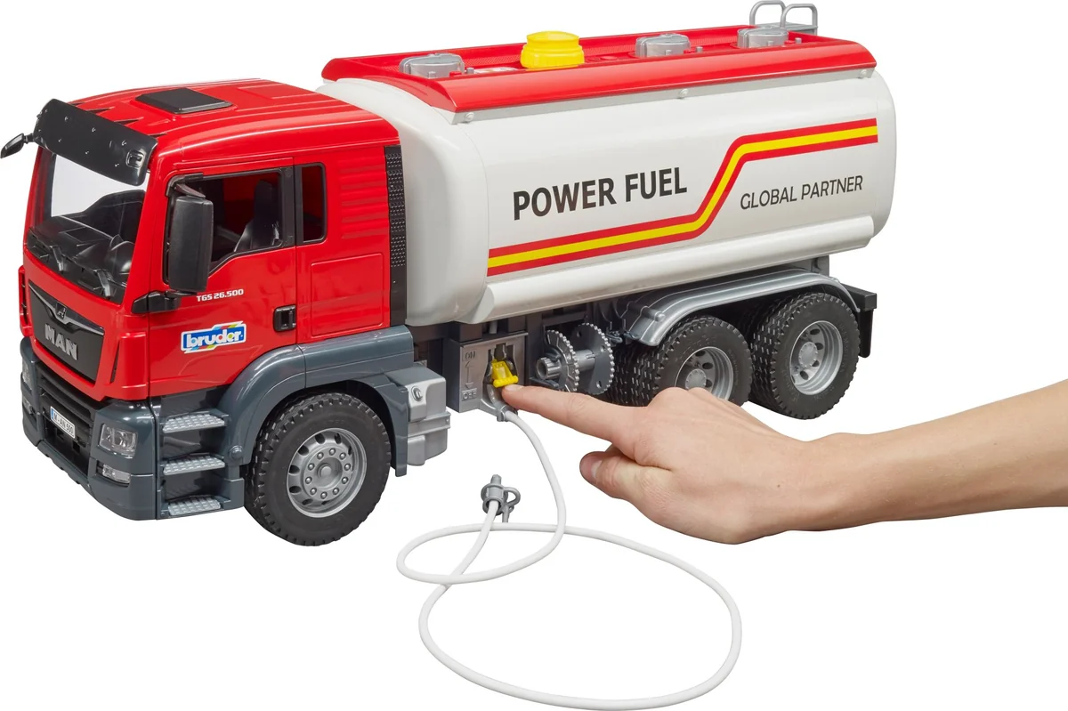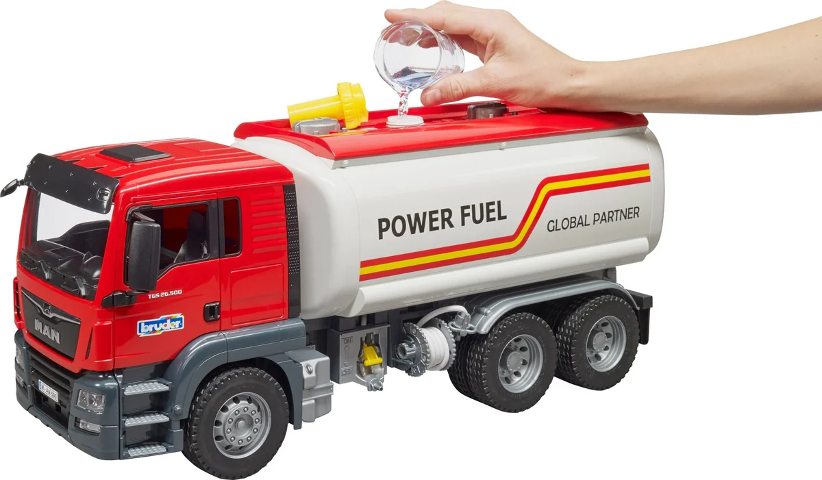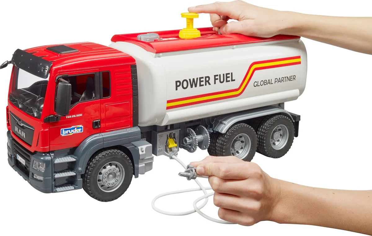 Türen zum Öffnen. Kabinenscheiben aus transparentem und bruchsicherem Kunststoff. Klappbare Außenspiegel. Befüllbarer Wassertank und funktionsfähige Pumpe. Ab 4 Jahren. Der MAN TGS ist der perfekte Allrounder für Baustelle, Fernverkehr und Nahverteilung. Robust gebaut, mit durchzugsstarken Motoren ausgestattet und mit einer überdurchschnittlichen Nutzlast ist dieser LKW der ''Alleskönner, der jede Menge Innovationen an Bord hat. Das BRUDER Modell des MAN TGS Tankwagen im Maßstab 1:16 ist eine Kombination aus dem neuen MAN Fahrerhaus und dem neu entwickelten Tankwagen-Aufbau. Dieser voll funktionsfähige Tank bringt jede Menge neue Funktionen für kleine Tankwagenfahrer. Wasser kann in den Tank gefüllt werden. Mittels der eingebauten Handluftpumpe wird Druck aufgebaut und mit der seitlich angebrachten Ablasseinheit kann durch Betätigung des Absperrhebels das Wasser durch den Schlauch abgelassen werden.