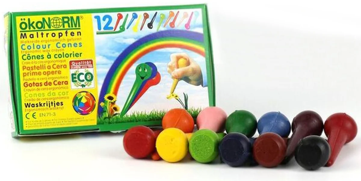 Maltropfen sind auch für kleinere Kinder, die noch Schwierigkeiten mit der Stiftform und leicht brechbarer Wachsmalkreide haben. Durch die handliche Tropfenform ist ein malerisches Gestalten mit kräftigen Linien und großen Flächen möglich.