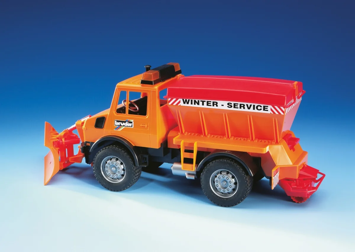Das Räumschild des MB-Unimogs Winterdienst ist beweg- und absetzbar. Der Silodeckel kann geöffnet und das Silo befüllt und durch Betätigen des Schiebers verschlossen werden. Das Streuwerk ist voll funktionsfähig. Profilreifen runden das Bild ab. Zur Spielergänzung kann der MB-Unimog Winterdienst mit Räumschild mit dem Light and Sound Module, Art.-Nr.: 02801 ausgestattet werden (nicht im Lieferumfang enthalten).