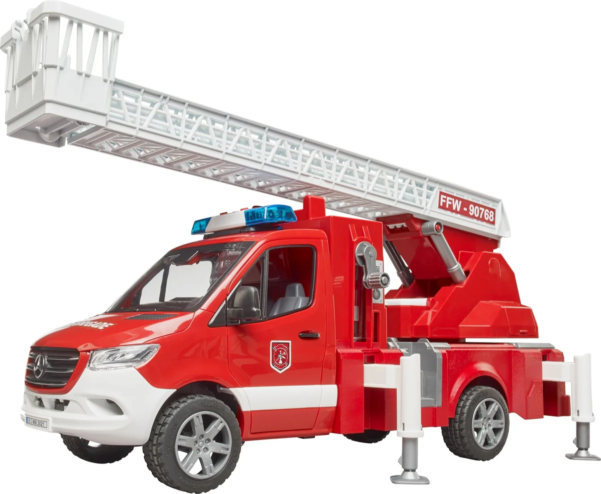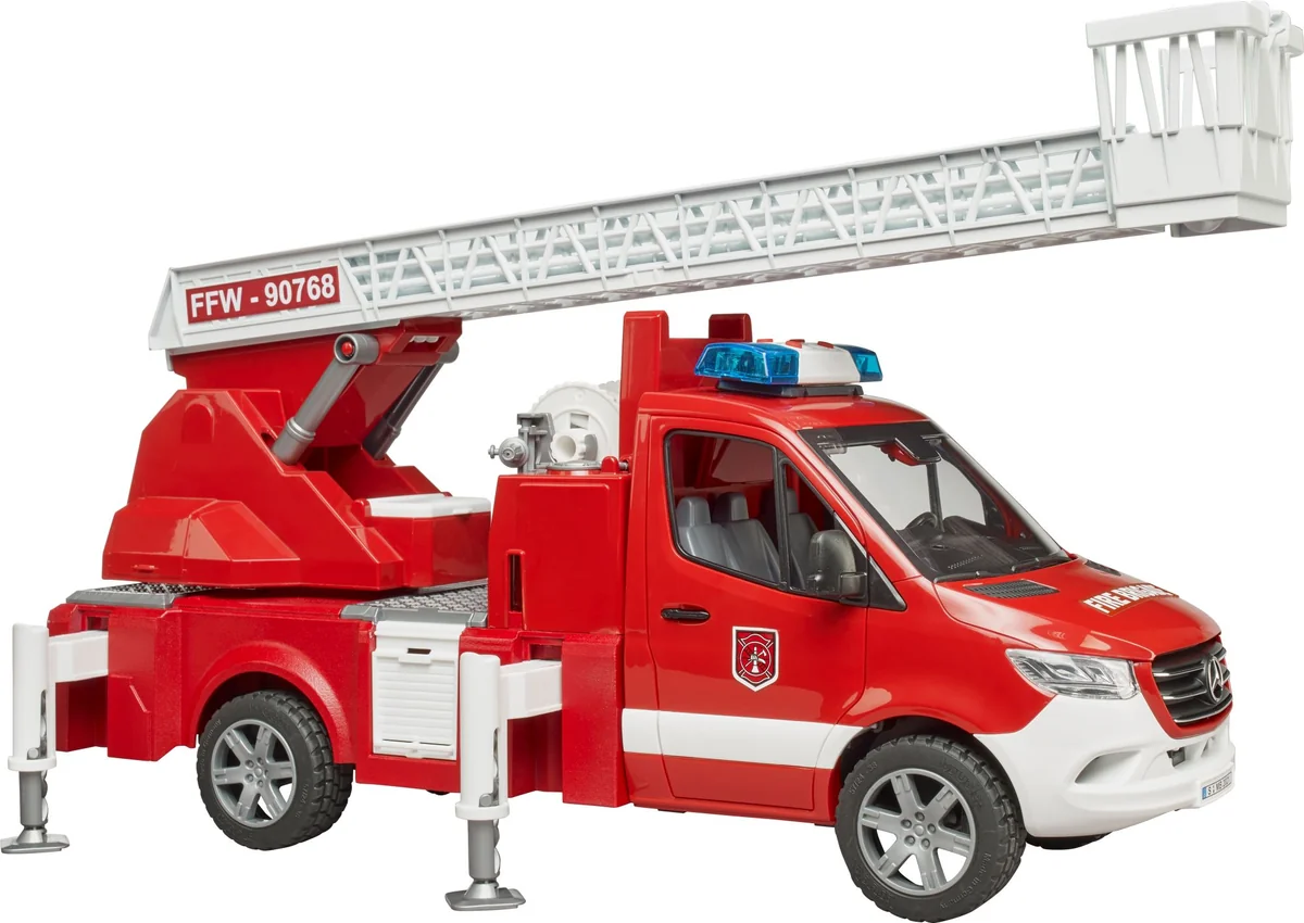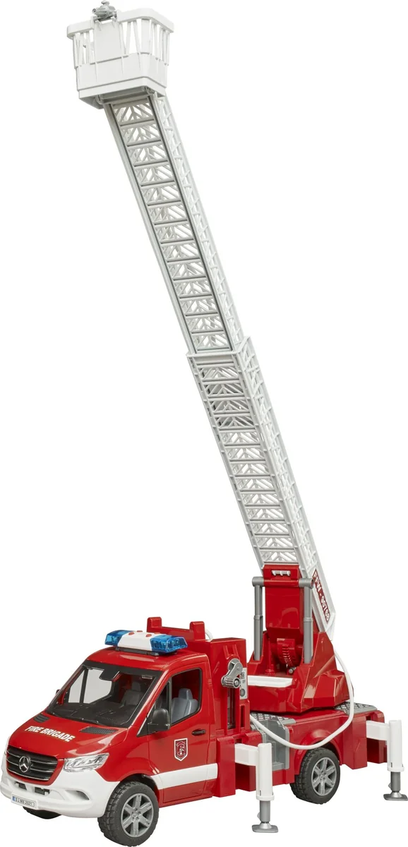 Zukunftsweisend, effizient, zuverlässig so beschreibt Mercedes Benz den neuen Sprinter. Auch in der neuesten Generation bleibt er der vielseitige und allseits beliebte Transportprofi. Im umfangreichen Sortiment von BRUDER sind die neuesten Sprinter in unterschiedlichsten Varianten angekommen. Für schwierig zu bekämpfende Brandherde beispielsweise in engen Altstadtgassen werden zunehmend kleinere Löschfahrzeuge eingesetzt. Hervorragend bewährt hat sich hierbei der Sprinter aufgrund seiner enormen Wendigkeit. BRUDER hat dieses Feuerwehrfahrzeug mit vielen realistischen Funktionsdetails ausgestattet. Im Mittelpunkt steht dabei die ausfahrbare Drehleiter mit Rettungskorb und die voll funktionsfähige Wasserspritze mit sichtbar arbeitender Kolbenpumpe, Wassertank und ausfahrbaren Stützfüssen, verschiedene Werkzeugaufnahmebehältnisse, sowie das Light & Sound Modul runden den sehr hohen Spielwert dieses Fahrzeugs ab.