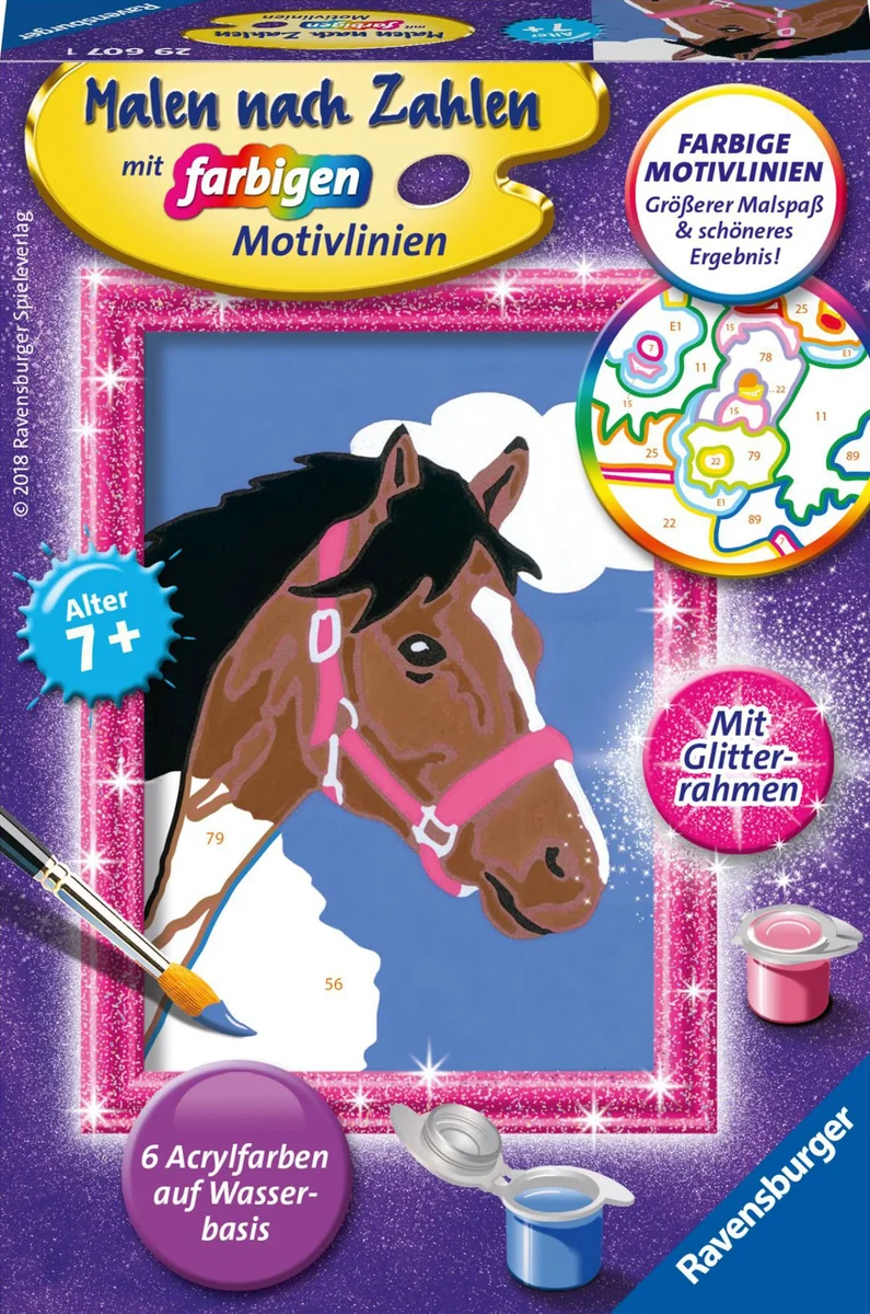 Farbige Motivlinien: Größerer Malspaß & ein schöneres Ergebnis!Dank der farbigen Motivlinien, können die Kinder das ganze Motiv Pferd und die Farben schneller erkennen. Der Pinsel hat eine gute Führung und so entsteht nach und nach ein perfektes Bild.Die schönen Motive zum Ausmalen sind eine tolle Geschenkidee für Kinder ab 7 Jahren und eine schöne Dekoration für das Kinderzimmer. In diesem Malset sind bereits 6 fertig gemischte Acrylfarben enthalten.Mit Malen nach Zahlen von Ravensburger lernen die Kinder Flächen sorgfältig auszumalen, ihr Maltalent zu verbessern sowie feinmotorische Fähigkeiten zu entwickeln. Am Ende stehen Freude, Stolz und ein Erfolgserlebnis, das die Lust am Weitermalen weckt.Die Motive sind altersgerecht in drei Schwierigkeitsstufen umgesetzt: von einfachen Bildern mit wenigen, großen Malflächen bis hin zu Bildern mit vielen, kleinen Malflächen für Fortgeschrittene.Jedes Malset enthält alles, was Künstler zum Malen brauchen und es ist kein Mischen der Farben notwendig.Das Ravensburger Malen nach Zahlen Programm bietet eine große Motivauswahl für Kinder und Erwachsene.