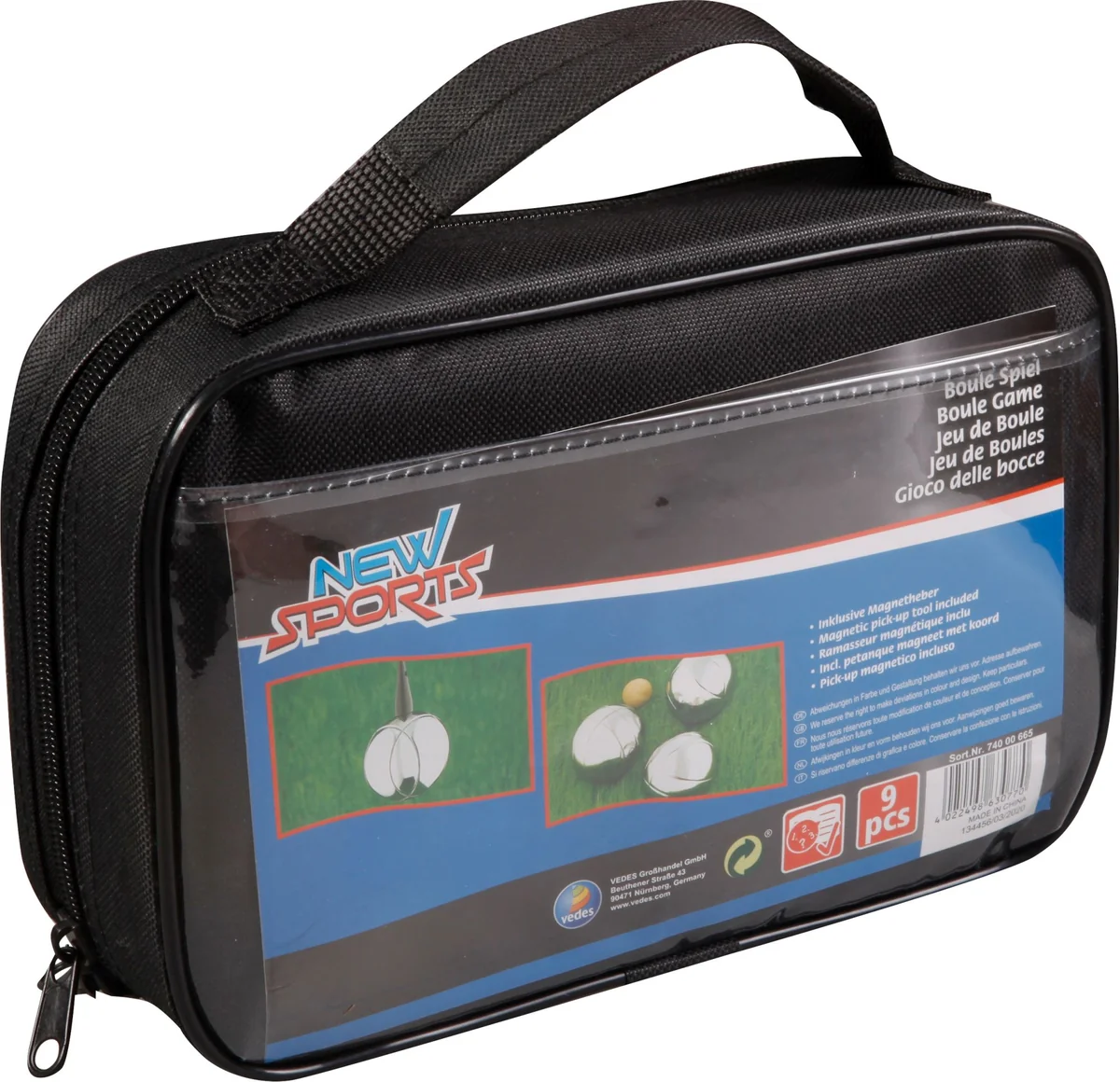 Set mit 6 Metallkugeln, Magneten zum Aufheben der Kugeln und Nylontasche. Kugel # ca. 73 mm. Ab 3 Jahren. New Sports Boule-Spiel mit Magnetheber. Bestehend aus sechs Metallkugeln, Magneten zum Aufheben der Kugeln und einer Nylontasche zur Aufbewahrung des Spiels. Die Kugeln sind it Steinpuder gefüllt. Das äußere der Kugel ist aus einer Eisenbeschichtung. Durchmesser einer Kugel ca. 73 mm. Gewicht einer Kugel ca. 716g.