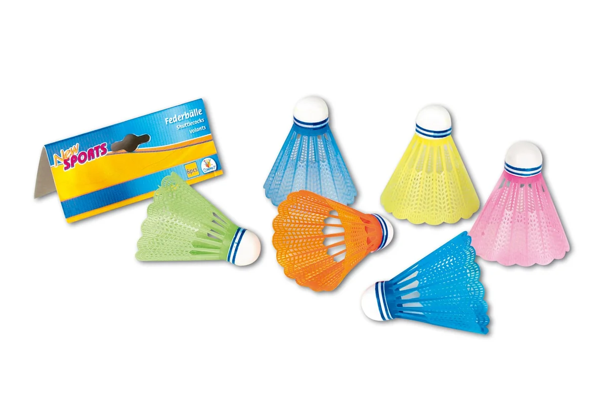 Federbälle 6 Stück. In verschiedenen Farben. Länge ca. 7 cm. Für Kinder ab 3 Jahren. New Sports Federbälle, bunt, 6 Stück im Beutel. Länge 7cm. Für Kinder ab 3 Jahren.