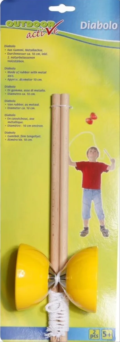 Laufstark mit Metallachse. # 10 cm. Länge Stäbe ca. 35 cm. Ab 6 Jahren. Outdoor active Diabolo, 2-fach sortiert in den Farben gelb und rot. Aus hochwertigem Kunststoff. Durchmesser 10cm. Maße der Stäbe ca. 35cm. Laufstark mit Metallachse. Auf Blisterkarte. Kartengröße: W165xH503mm. Für Kinder ab 6 Jahren.