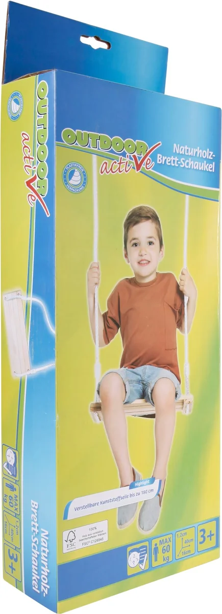Outdoor active Naturholz Brettschaukel aus massivem und wetterbeständigem Holz. Ausgestattet mit 10mm Kunststoffseilen, die durch Eisenringe und Stellachten verstellt werden können. Verstellbar bis zu 180cm. Maximale Belastung 60kg. Maße ca. 40x16x7cm. Für Kinder ab 3 Jahren.