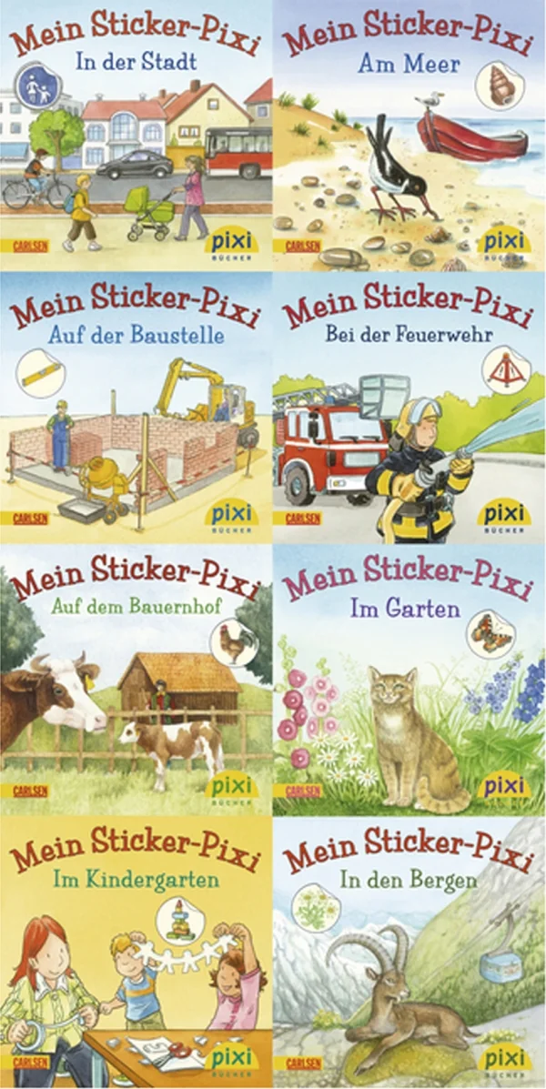 Meine Sticker- Pixis Neben der beliebten klassischen Pixi Serie, wurde nun ein vollkommen neues Konzept entworfen: Der große Pixi- Sticker- Spiel- Spaß für Jungen und Mädchen. Auf jeder Seite lassen sich zu großen Sachthemen und Geschichten gummierte Sticker beliebig oft ablösen und individuell platzieren. Die durchsichtigen Sticker- Ränder erlauben ein optisch perfektes Einfügen, so dass Kinder bestimmte Szenen immer wieder neu konzipieren können. ein großer Spiel- Spaß mit Leseverständnis und Herausforderungen neuartiges Konzept insgesamt 8 große Sachthemen mindestens 16 Sticker pro Pixi tolle Technik <(>&<)> Optik Meine Sticker- Pixis Neben der beliebten klassischen Pixi Serie, wurde nun ein vollkommen neues Konzept entworfen: Der große Pixi- Sticker- Spiel- Spaß für Jungen und Mädchen. Auf jeder Seite lassen sich zu großen Sachthemen und Geschichten gummierte Sticker belie big oft ablösen und individuell platzieren. Die durchsichtigen Sticker- Ränder erlauben ein optisch perfektes Einfügen, so dass Kind er bestimmte Szenen immer wieder neu konzipieren können. Ein großer Spiel- Spaß mit Leseverständnis und Herausforderungen sowie neuartiges Konzept. Insgesamt 8 große Sachthemen und mindestens 16 Sticker pro Pixi. Tolle Technik-Optik. Ab 3 Jahren.