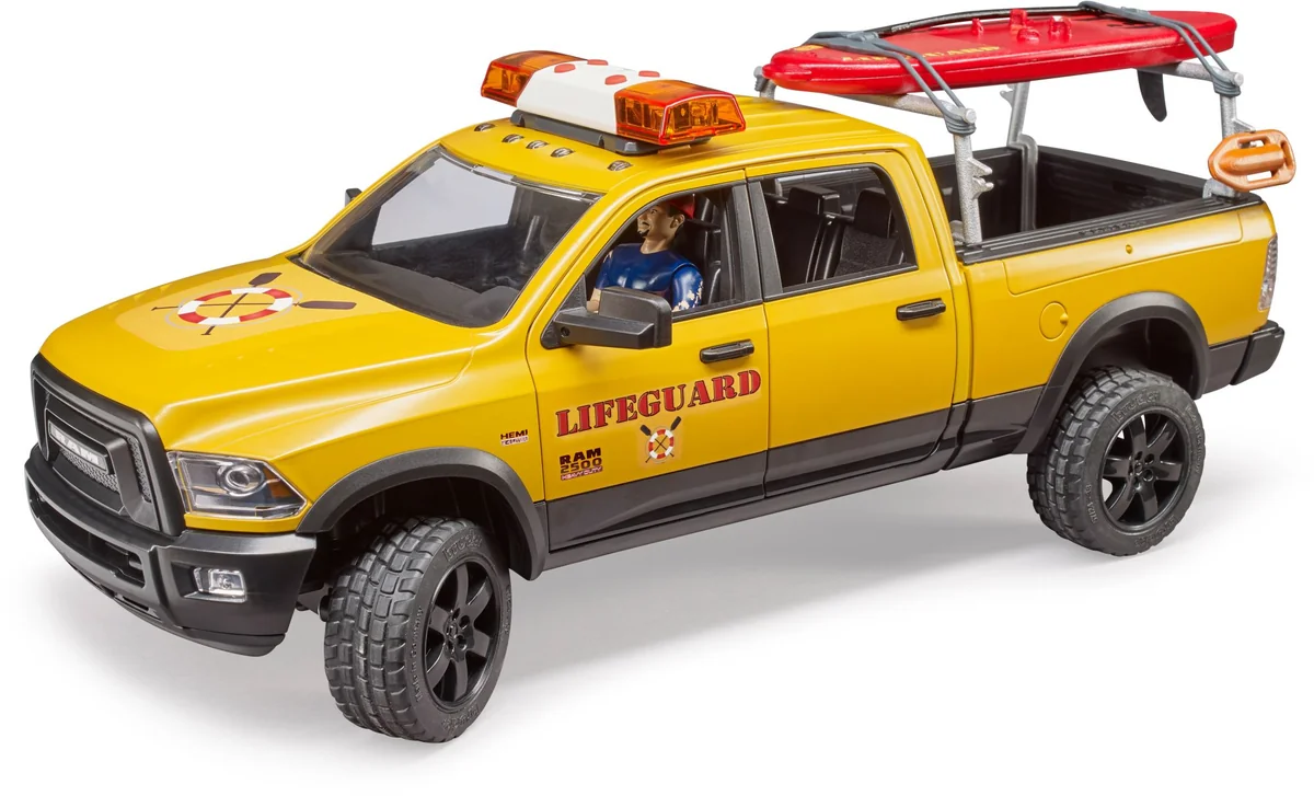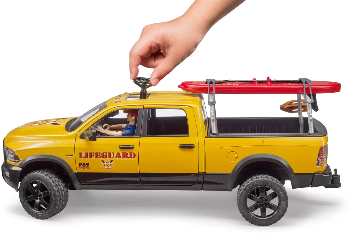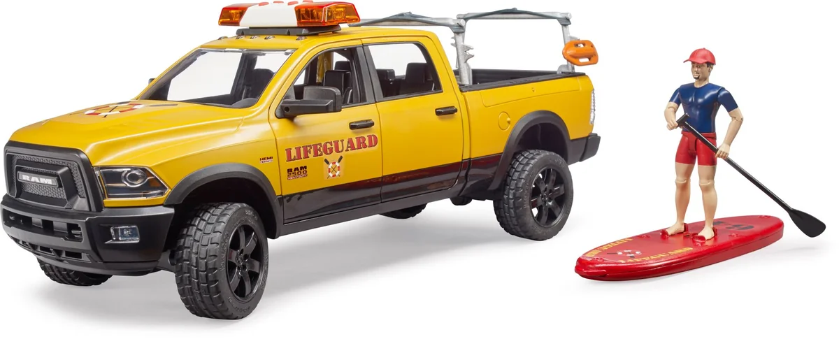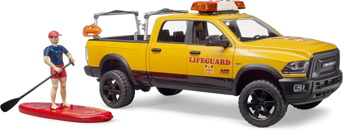 Erholung und Sport am und im Wasser hat bei BRUDER in der Themenwelt Freizeit eine hohe Bedeutung. Für die Sicherheit aller bworld Wassersportler ist ab jetzt der bworld Life Guard mit seinem RAM 2500 Powerwagon samt Stand Up Paddelboard (SUP) verantwortlich. Bei der Erfüllung seiner Aufgaben hat der Life Guard einen starken Partner. Die Robustheit und Geländegängigkeit des RAM ist legendär und bis heute einzigartig. Auch beim Thema Leistung ist dieser Wagen besonders eindrucksvoll. Sein V8 HEMI Motor leistet 410 PS und bringt es auf 582 Newtonmeter Drehmoment. Zusätzlich ist der Rettungsschwimmer mit einem SUP ausgerüstet. Damit ist er schnell an jeder Gefahrensituation auf dem Wasser. Der starke Auftrieb des Boards sorgt für ein stabiles Schwimmen.