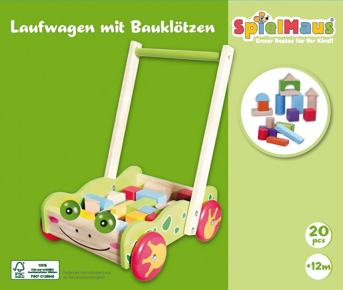 SpielMaus Holz Laufwagen mit 20 Bauklötzen. Der Laufwagen unterstützt Babys bei ihren ersten Gehversuchen. Schubhöhe ca. 39 cm. Maße ca. 29x26x39 cm. Für Kinder ab 12 Monaten.