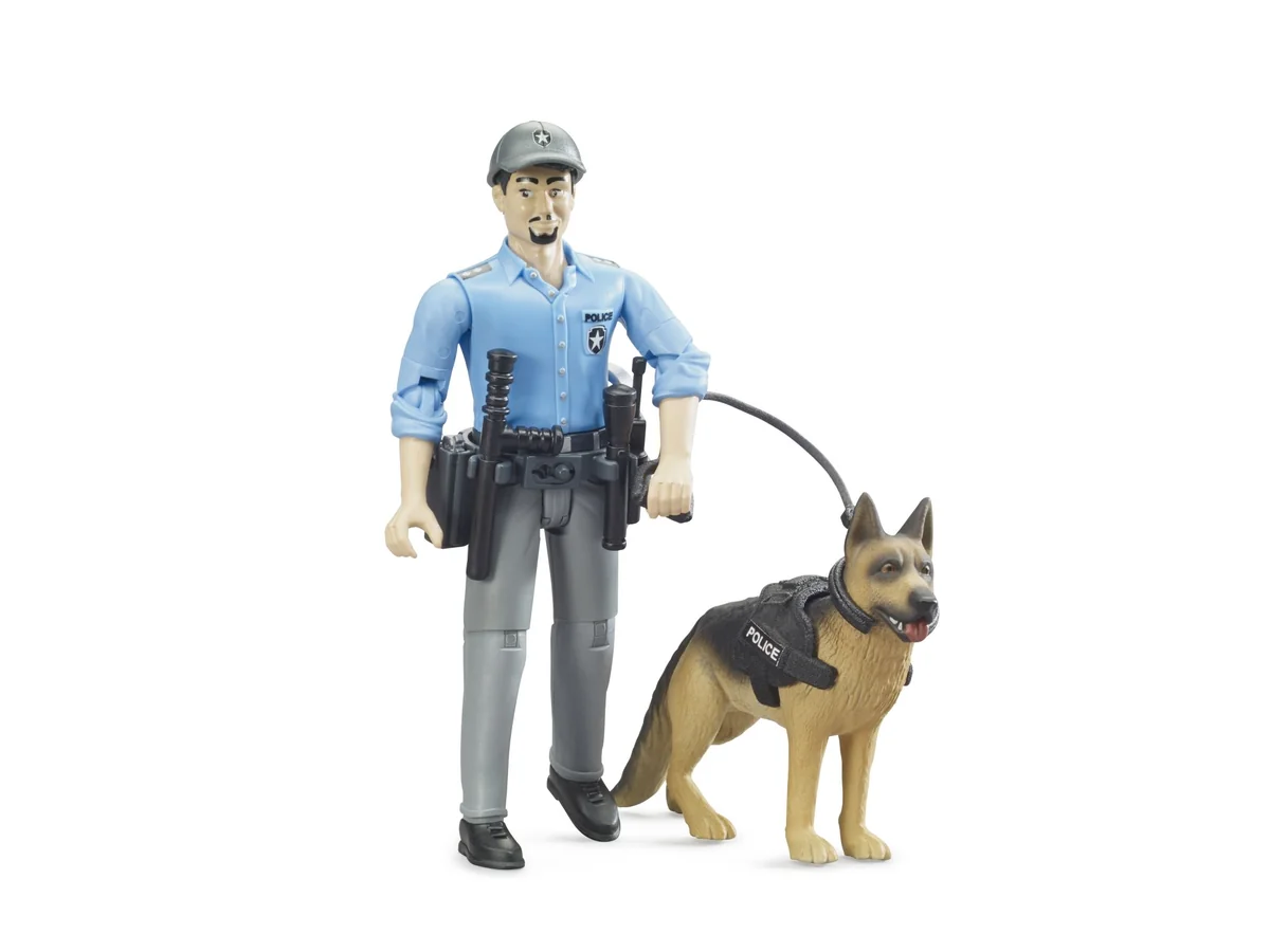 ''Seit über 200 Jahren unterstützen Hunde die Polizei bei Ihrer Tätigkeit. Dies ist durchaus naheliegend, verfügen Hunde doch über einen weitaus besseren Geruchssinn und besseres Gehör als Menschen. Damit unterstützen sie die Beamten bei einer Vielzahl von Such-, Schutz- und Rettungseinsätzen. Die BRUDER Einsatzkräfte begrüßen als neuestes Mitglied in ihrer Staffel den bworld Polizisten mit Hund. Dieser wird über Leine und Hundegeschirr sicher geführt. Der bworld Polizist ist voll ausgestattet um im Einsatz gut gerüstet zu sein. Der Pistolengürtel mit Taschenlampe, Funkgerät sowie Schlagstock sind dabei wichtige Utensilien.''