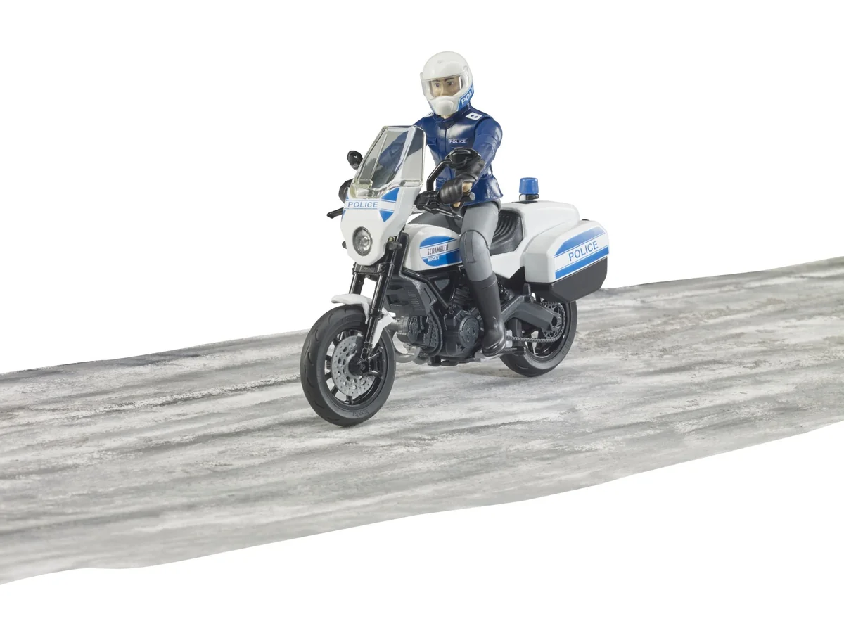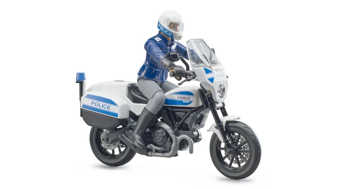 Das Motorrad auf Basis der Scrambler Ducati überzeugt mit seinem optisch modernen Polizei-Design mit Polizisten in moderner Schutzausrüstung. Maßstab 1:16. Ab 4 Jahren. Die bworld Polizei-Einsatzgruppe erhält Verstärkung. Neu zum Team dazugekommen ist der Motorradpolizist samt Polizeimotorrad. Die Vorteile beim Polizeimotorrad liegen in der Geschwindigkeit, Wendigkeit und dem geringen Platzbedarf. Damit überzeugt dieses Fahrzeug bei der Verkehrsüberwachung, Unfallaufnahme und bei Sicherungs- und Begleitmaßnahmen. Das Motorrad auf Basis der Scrambler Ducati überzeugt mit seinem optisch sehr modernen Polizei-Design und auch der Polizist ist mit moderner Schutzausrüstung ausgestattet. Aus den zahlreichen BRUDER- und bworld-Artikeln passen hierzu hervorragend die bworld Polizeistation (Art.-Nr. 62730) und der Land Rover Defender Polizeigeländewagen (Art.-Nr. 02597).